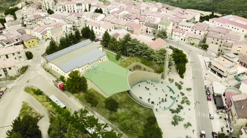 "Edificare oggi un edificio di culto in un piccolo paese della Basilicata, regione del sud tra le più provate dalla condizione di area interna, è quanto mail emblematico della resilienza di questa terra e delle sue genti. Affidare ancora una volta al più simbolico degli edifici architettonici, la Basilica Cristiana, il gravoso compito di traghettare queste genti nel futuro, questo in sintesi il programma. Il sito scelto si presta quanto mai alla sfida. Apparentemente un non luogo si trasformerà presto nel cuore pulsante della comunità. La posizione baricentrica rispetto al tessuto edificato fa si che la piazza-sagrato diventi una vera e propria cerniera urbana riconnettendo l'abitato di nuova edificazione con quello medievale ed ottocentesco. Il nuovo complesso si adagerà nell'ambiente urbano in modo estremamente rispettoso, seguendo i pendii collinari che caratterizzano il paesaggio limitrofo. Il paesaggio con tutti gli elementi che lo caratterizzano, ulivi, terra, acqua e tufo, si fonderà con il complesso cosicché i tetti diventeranno giardini ricoperti di sedum a bassa manutenzione e lenta crescita e piante autoctone, il sagrato sarà abitato da ulivi e nastri d'acqua e la rupi di arenaria plasmeranno la facciata prima di rivestire le pareti dell'aula liturgica".