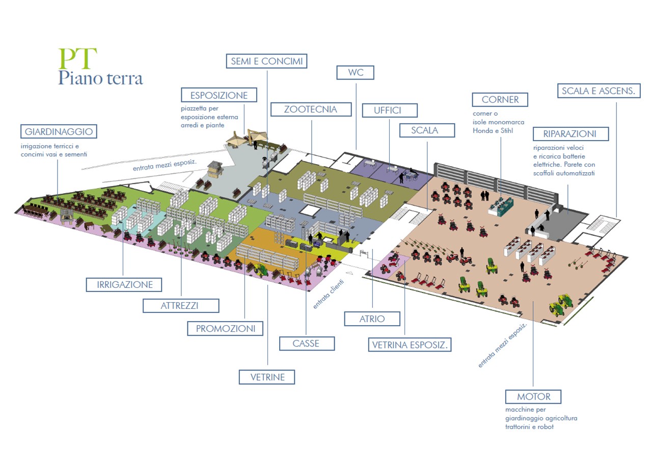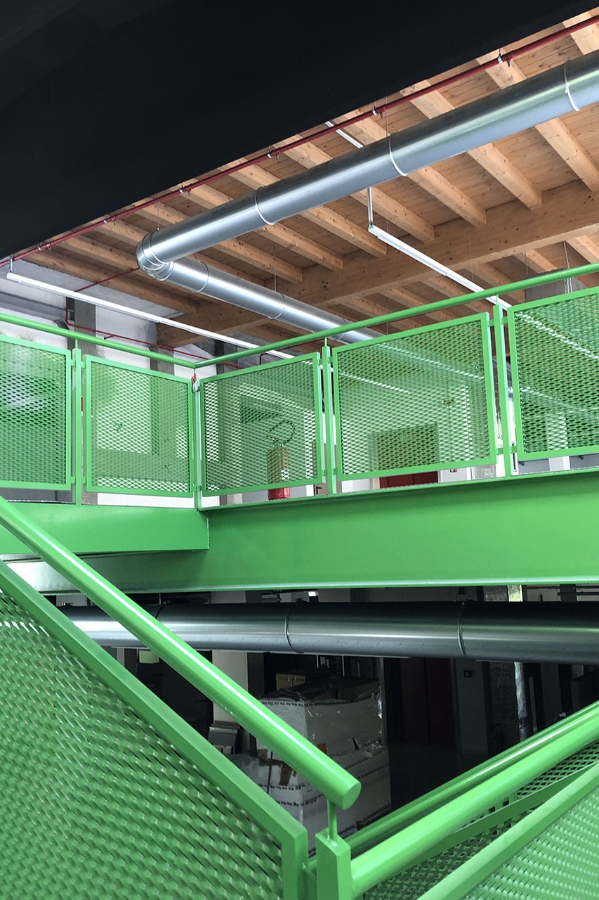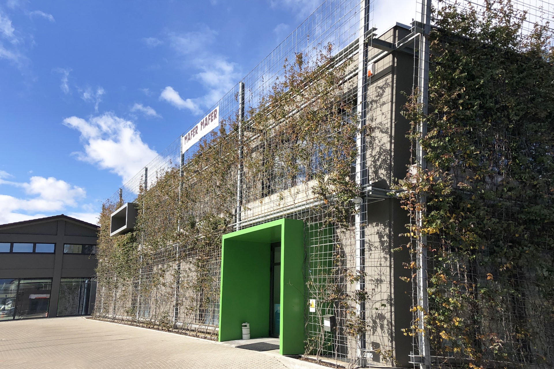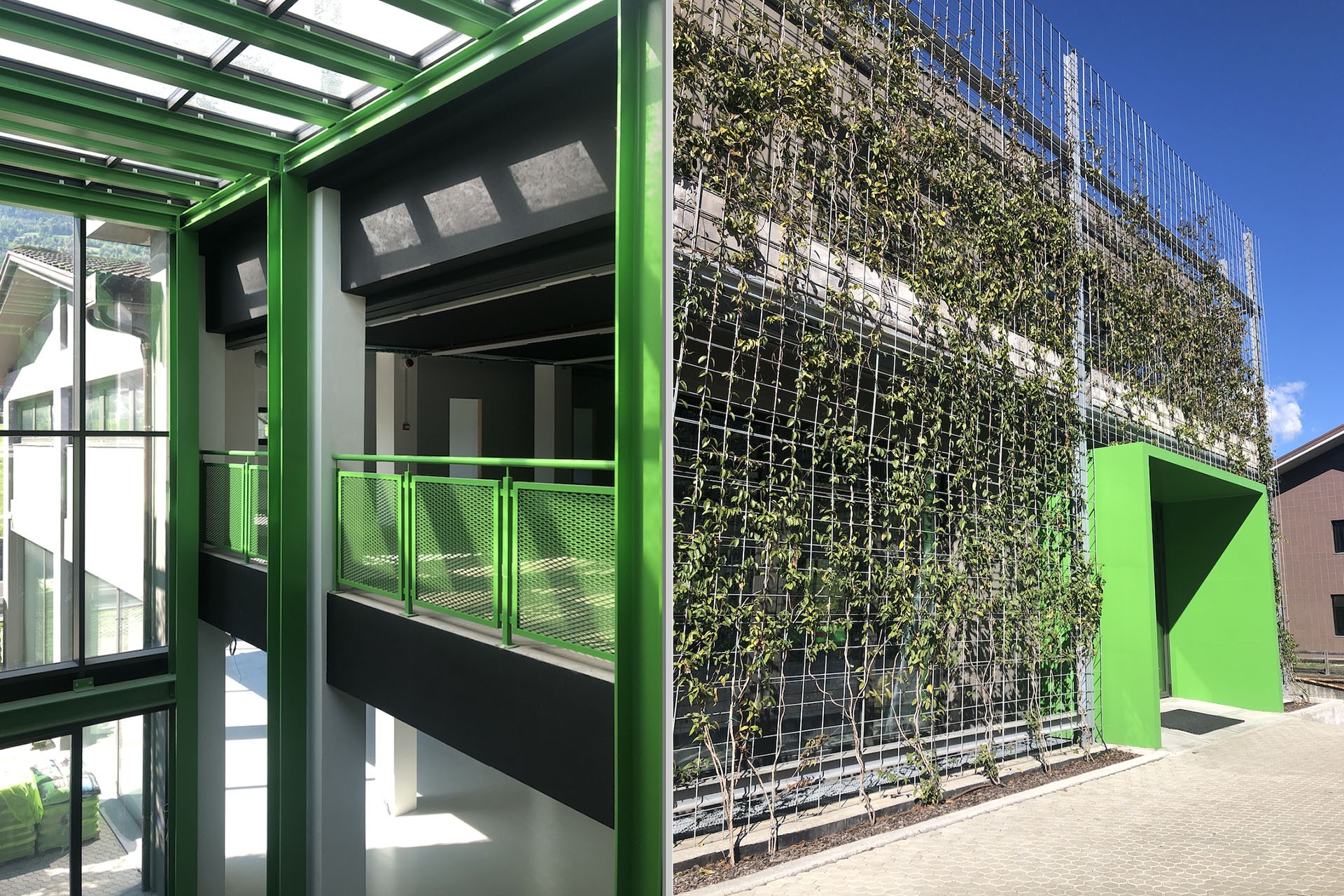 Il landmark rappresentato dalla quinta verde alta 7 m e lunga 30 m che si pone lungo la strada regionale a sud diventa l’ideale manifesto della nuova filosofia aziendale.