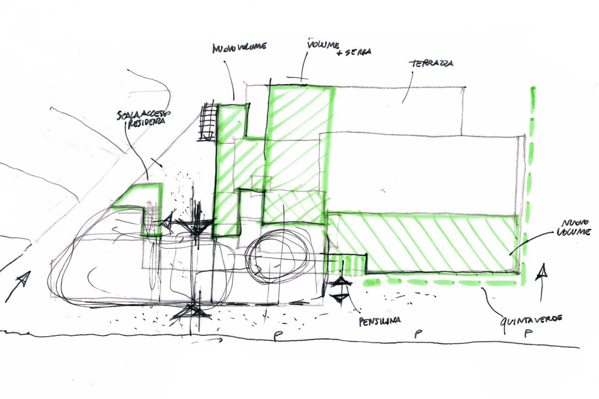 Il verde naturale introdotto sia in corrispondenza delle sistemazioni esterne che su parti dell’edificio diventa elemento fondamentale del progetto di riqualificazione.