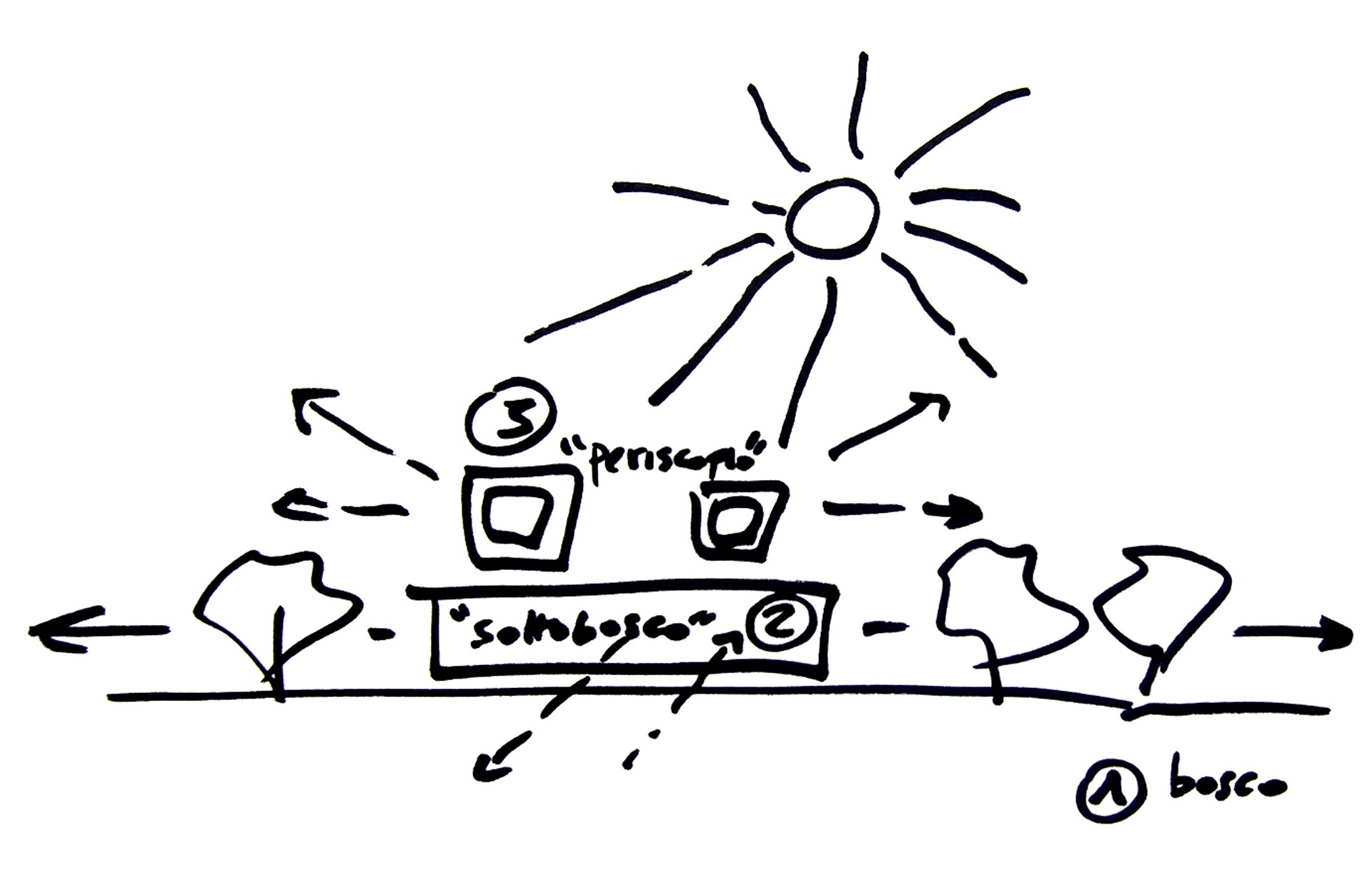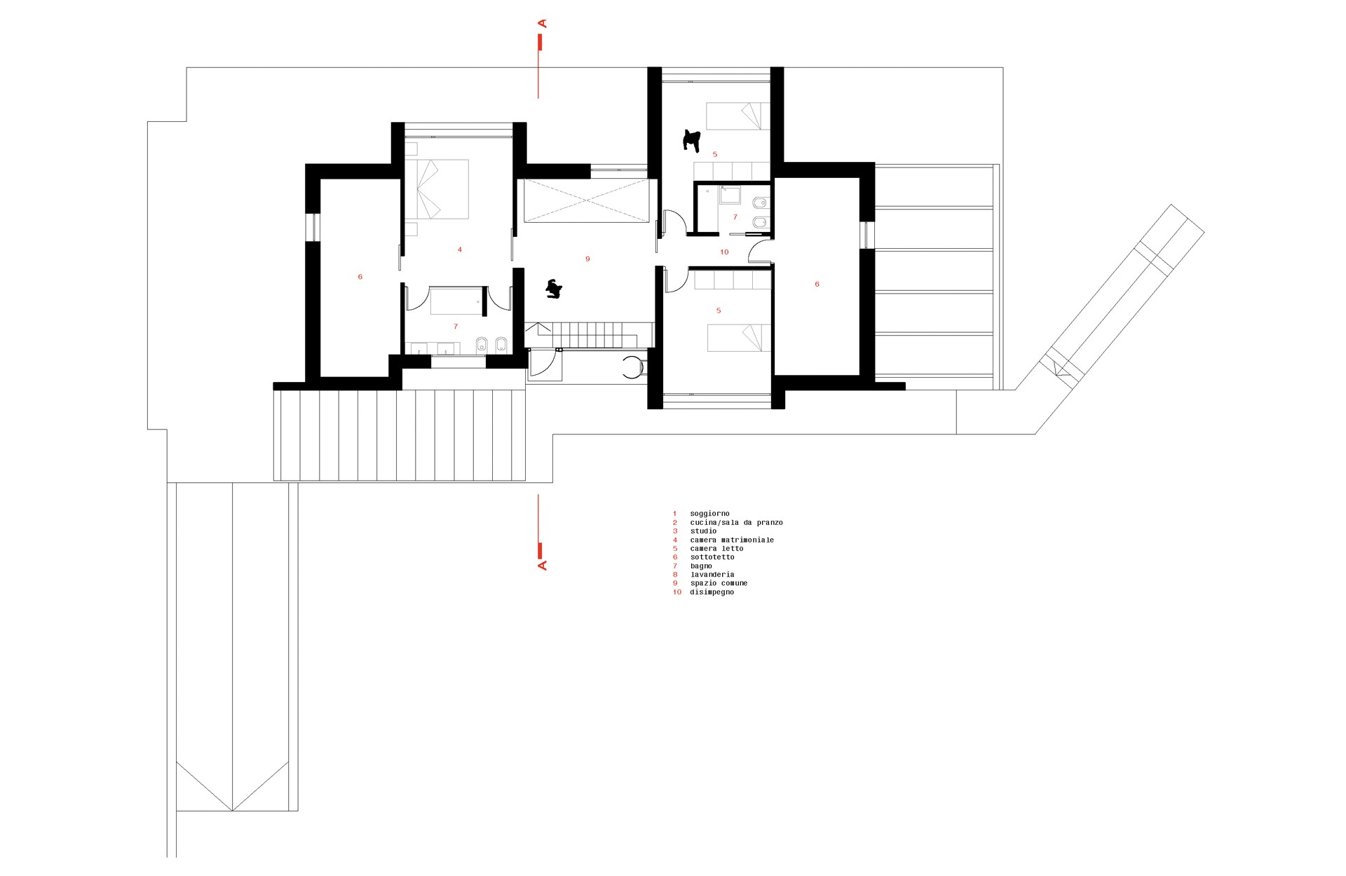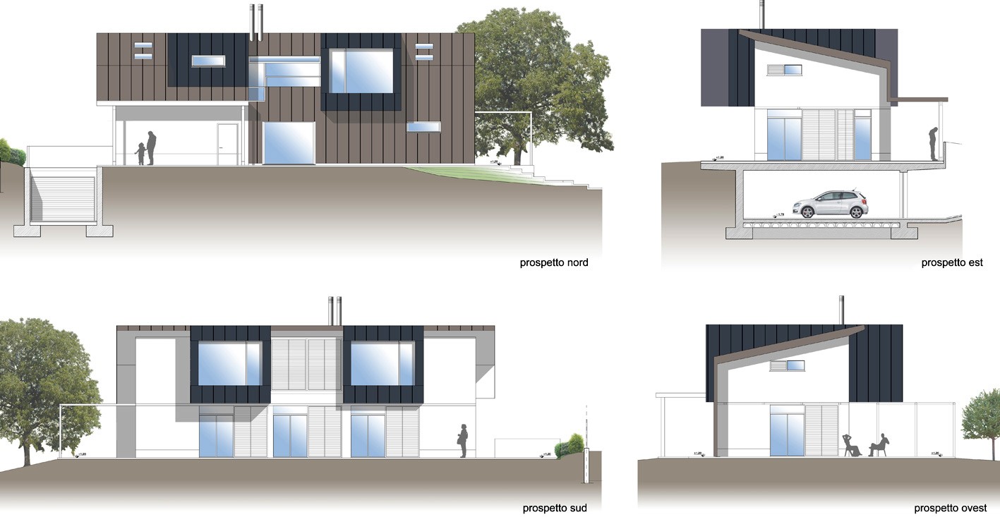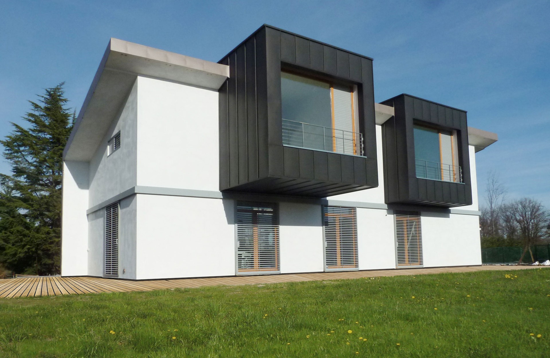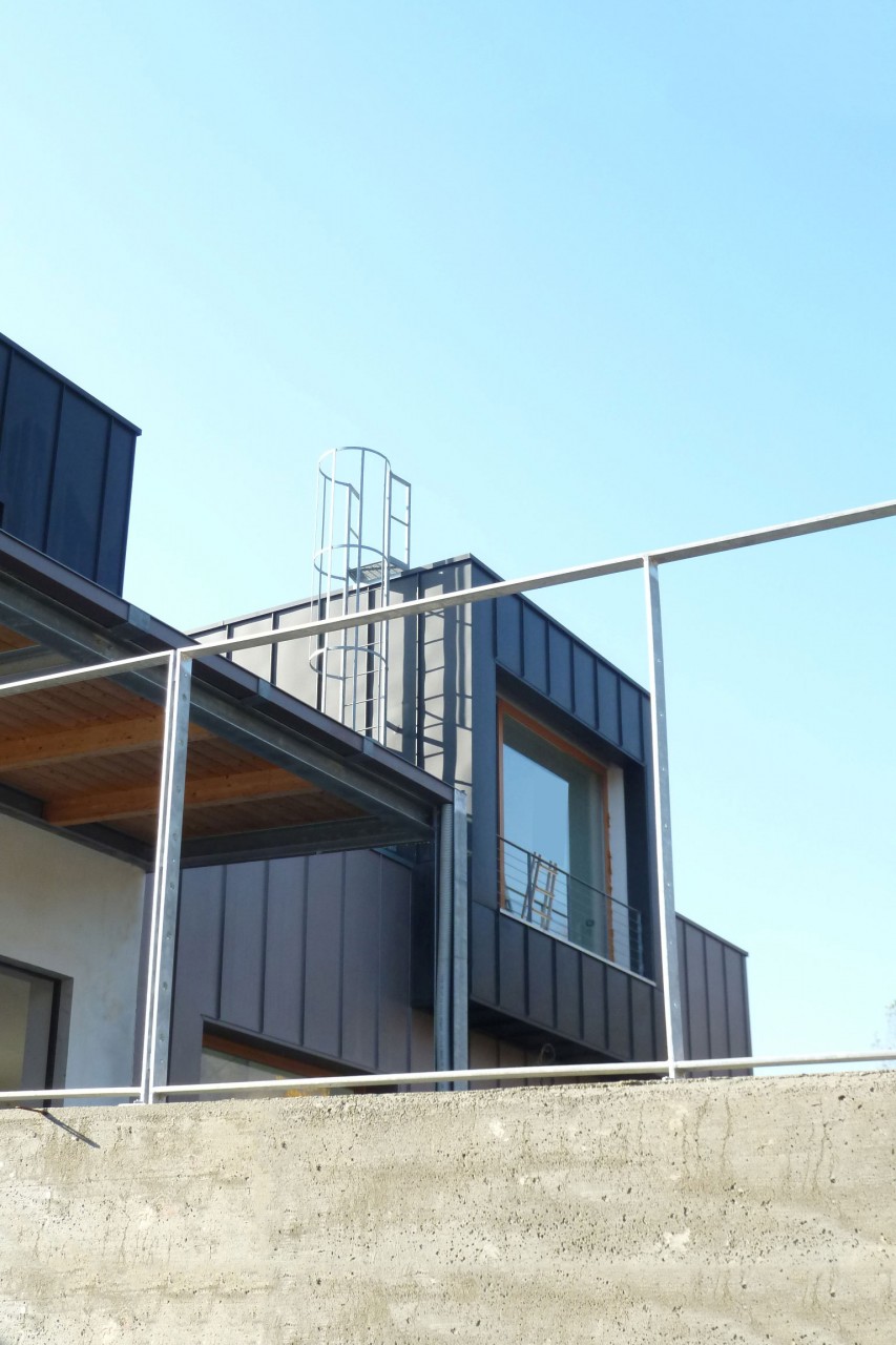 L’edificio è immerso nel parco Regionale della Mandria, a poca distanza dalla Reggia di Venaria Reale e si sviluppa su due livelli fuori terra di cui il piano terreno destinato alla zona giorno e il primo alle camere da letto e le zone studio più un piano interrato che ospita un’autorimessa-officina. I volumi sono caratterizzati da un corpo principale in muratura intonacata su cui si “posa” una scocca di zinco color terra che riveste il lato nord e parte della copertura. Al piano superiore due volumi di zinco color antracite si protendono verso il territorio per mezzo di grandi finestrature. Tutti gli spazi sono progettati in modo da ridurre al minimo gli affacci sui lotti confinanti, ma al contempo sono studiati per favorire la relazione tra interno ed esterno e la percezione del verde, del giardino al piano terreno e del territorio dal primo piano. Si è cercato un “dialogo ideale” con due opere di grande valore presenti nelle immediate vicinanze. La prima è la “Bizzarria”, casino di caccia della famiglia Savoia, a poche centinaia di metri dalla villa, che si pone quale punto di avvistamento sul parco e che serviva anche da rifugio privato. La seconda si trova nel Comune di Pianezza ed è la sede degli uffici della società F.A.T.A., opera degli anni ’70 del maestro brasiliano Oscar Niemeyer.
