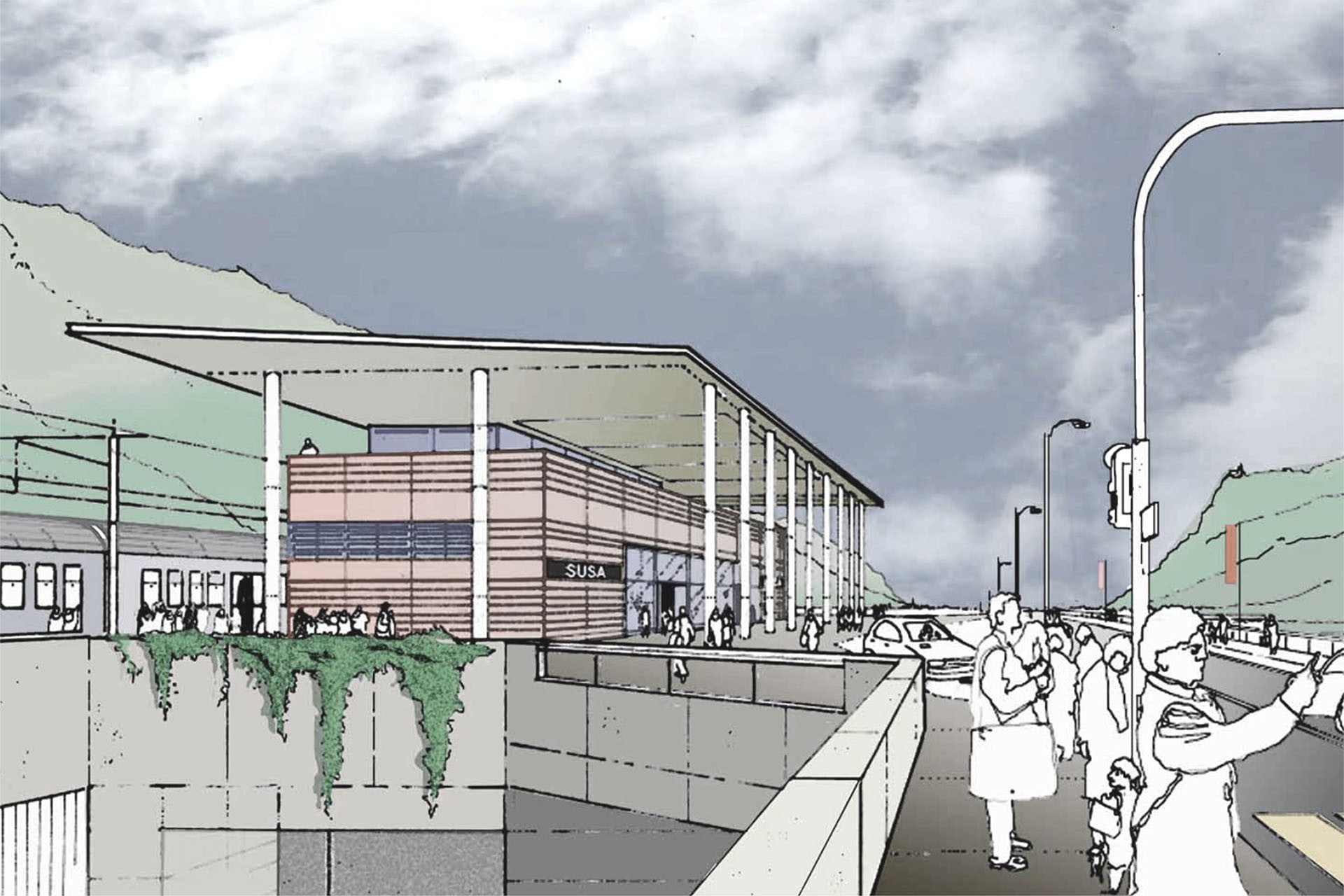La stazione di Susa Est si stende longitudinalmente nella valle, la sua posizione in rapporto alla scala del sito, restituisce un “segno” forte che fa da contrappunto all’edificio degli uffici SITAF.