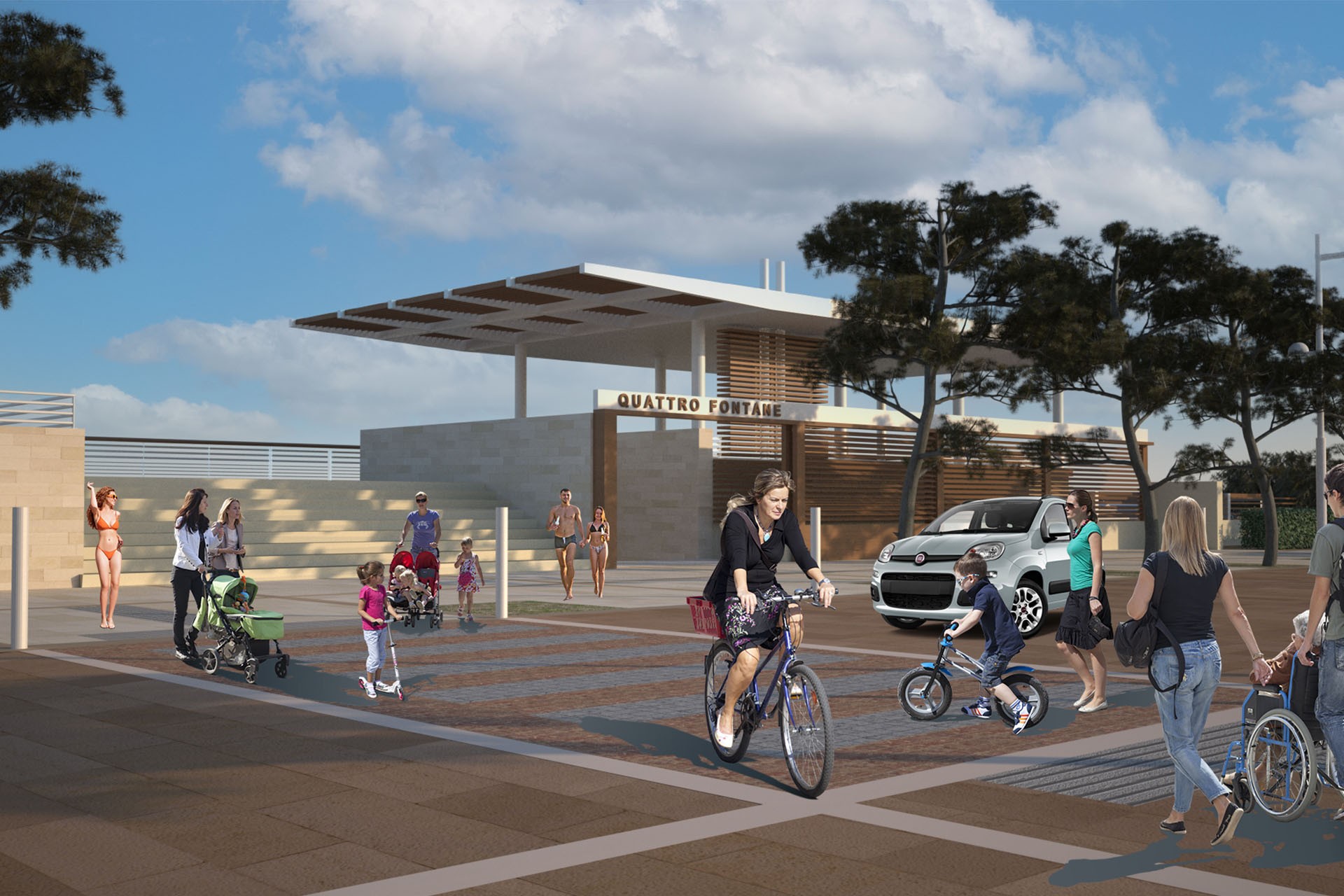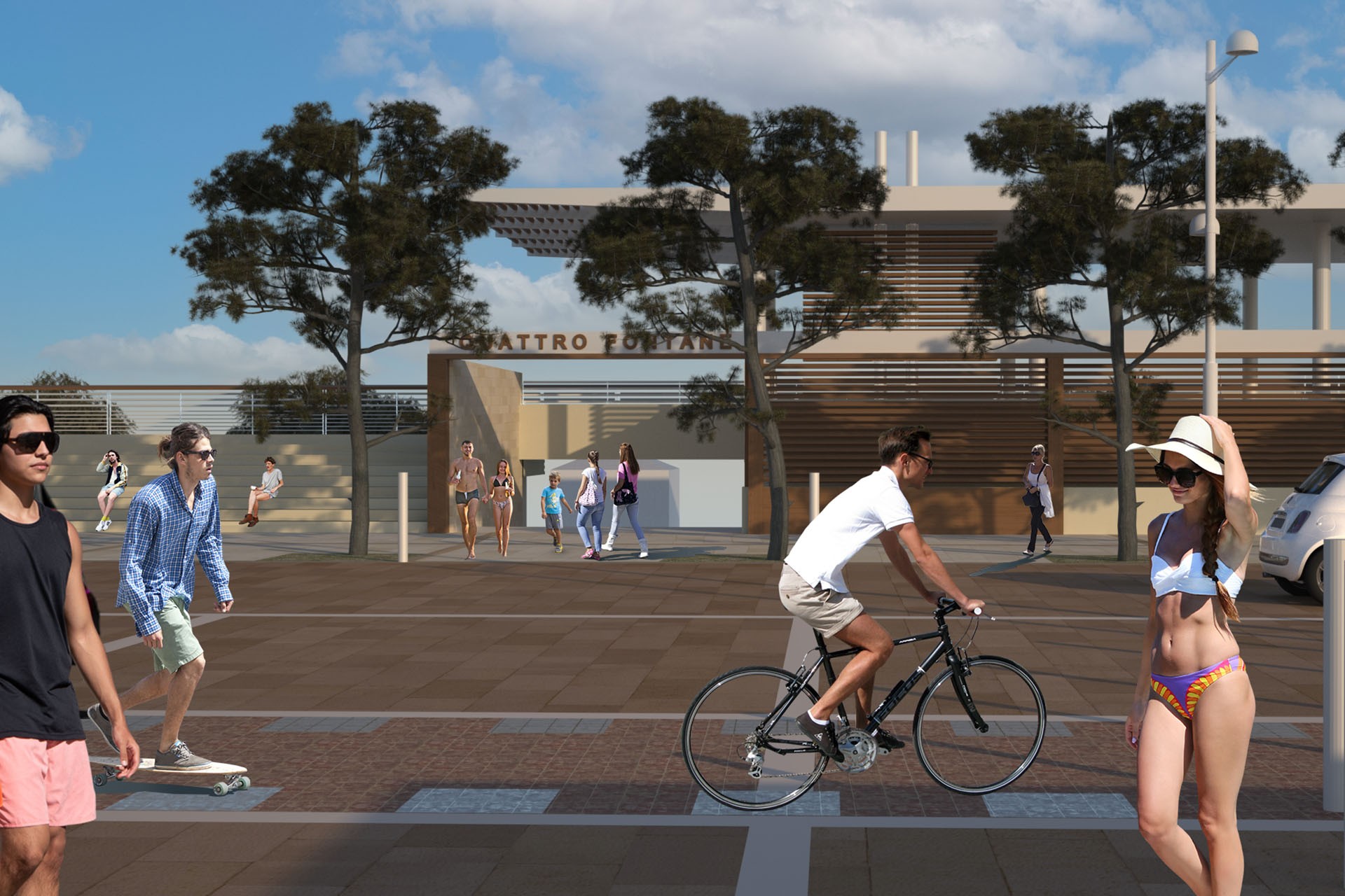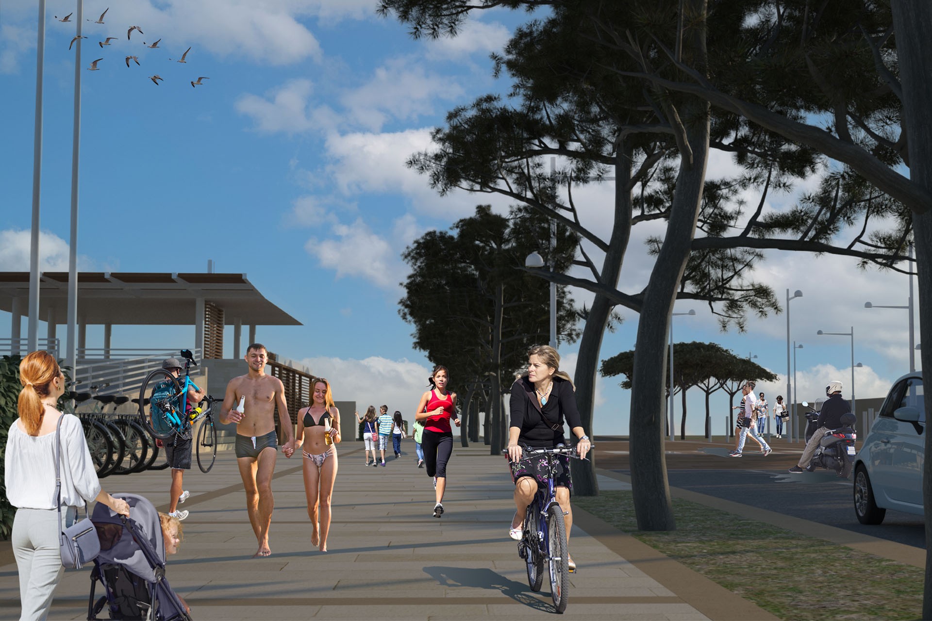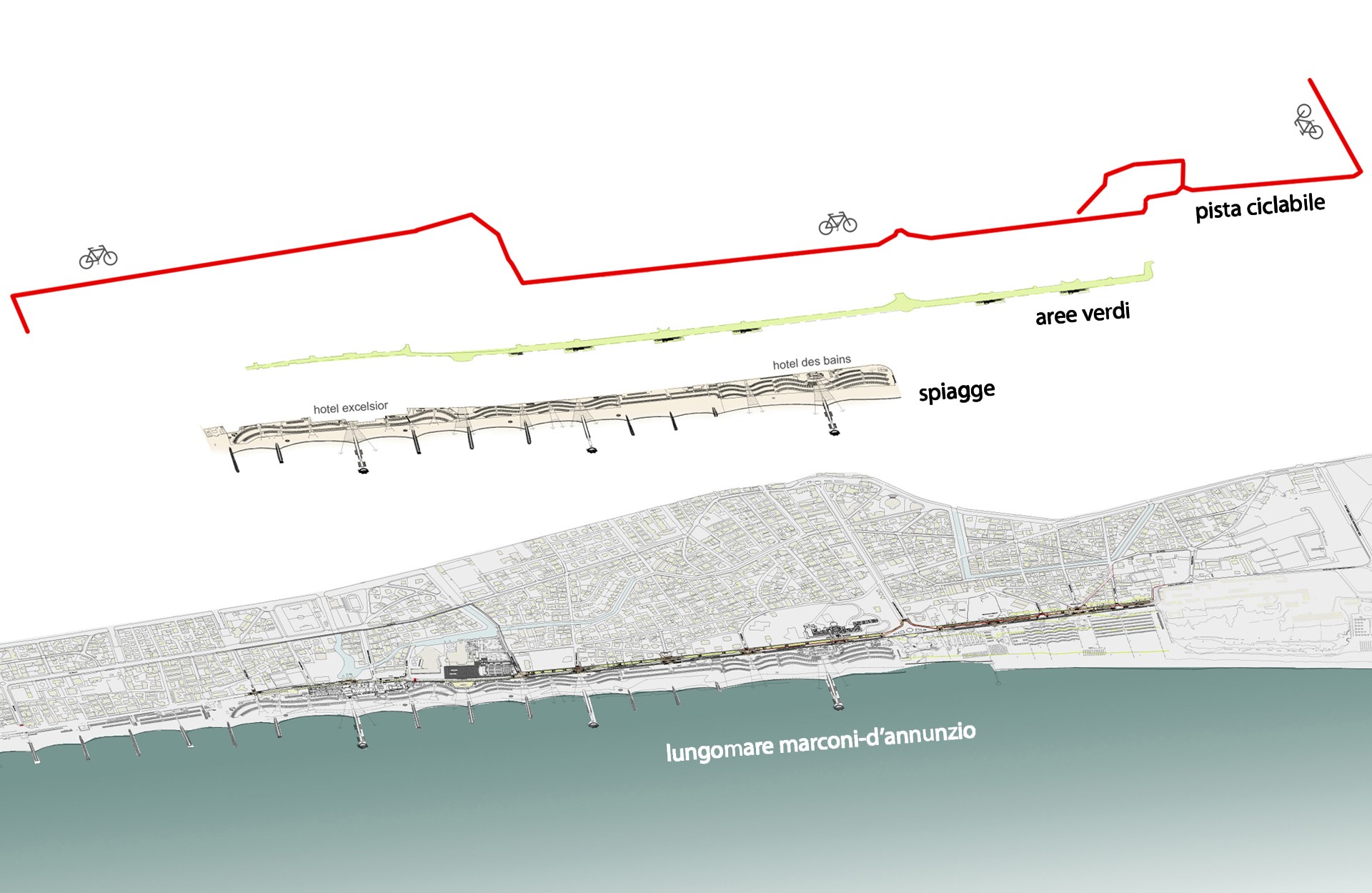 Il progetto prevede la realizzazione di terrazze-belvedere quali dispositivi di transizione-cerniera tra l’asse urbano e le spiagge che permettono la permeabilità visiva e assolvendo alla funzione di nuovi ingressi agli stabilimenti. Un nuovo tracciato ciclabile si inserisce nel sistema ciclabile "Vento", la nuova illuminazione pubblica e un arredo urbano su disegno completano un’opera che ambisce a definire una nuova identità al Lido.