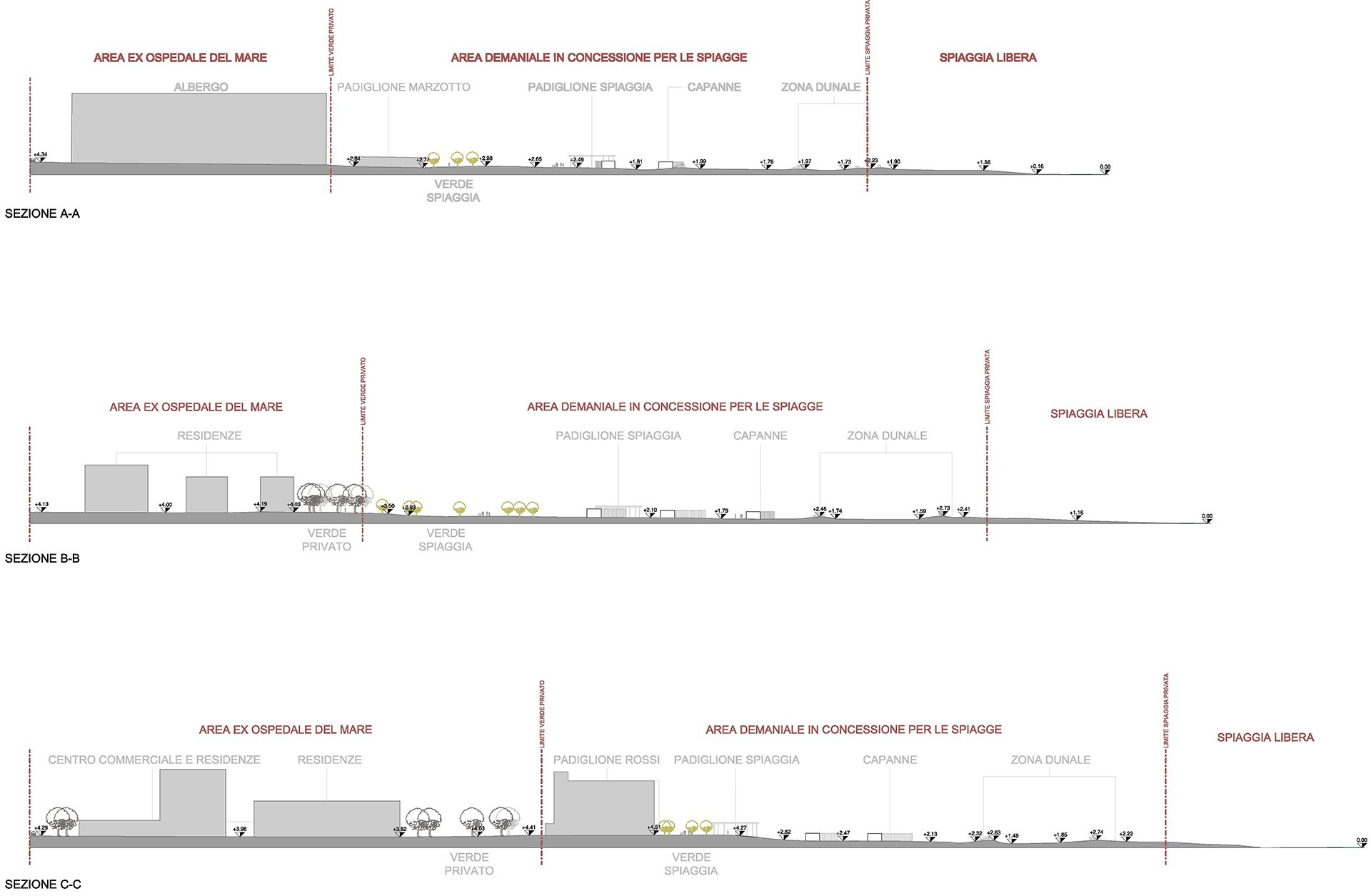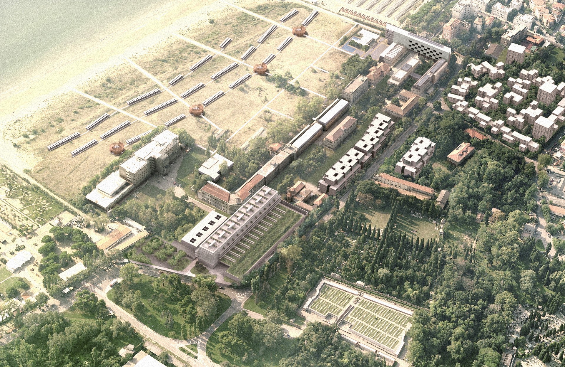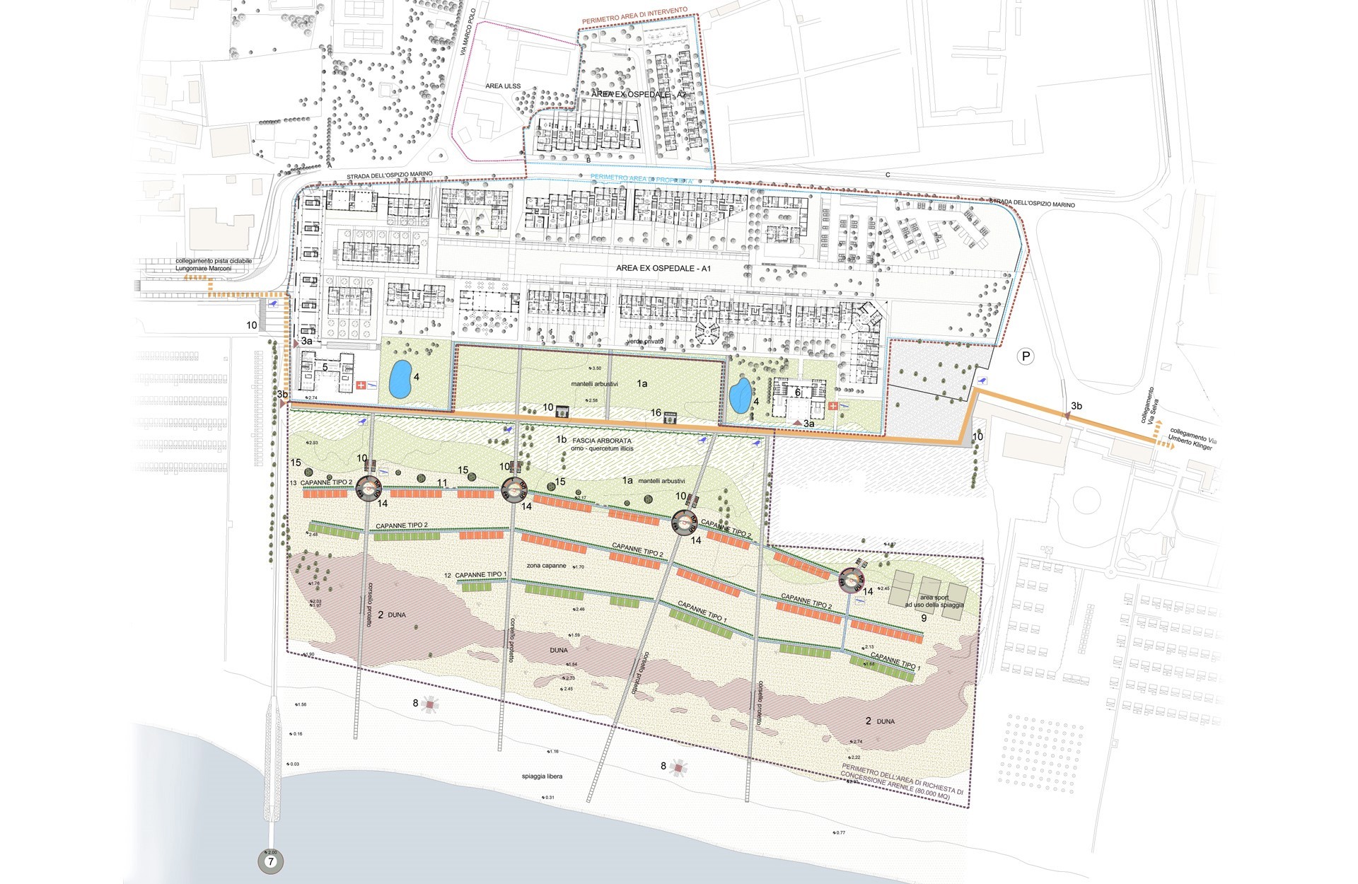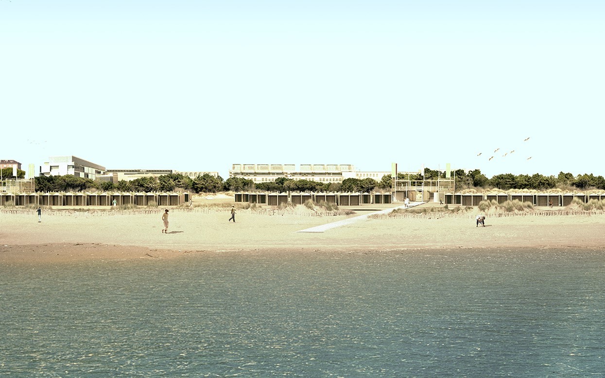 L’impianto planimetrico è caratterizzato da un andamento “fluido” che consente la migliore transizione tra il mare, l’area naturalistica esistente e in progetto e il complesso residenziale e ricettivo previsto sul sedime dell’Ex Ospedale al mare. Per la qualità naturale del luogo è previsto un disegno delle strutture in dotazione alle spiagge che garantisca un basso impatto ambientale, partendo dai percorsi di distribuzione fino ad arrivare alle tipologie di capanne e alle strutture a servizio della spiaggia. È previsto un percorso principale di attraversamento compreso tra i due edifici a servizio della spiaggia (i padiglioni Schio e Marzotto), che si collega con i percorsi trasversali di collegamento alle capanne e al mare.