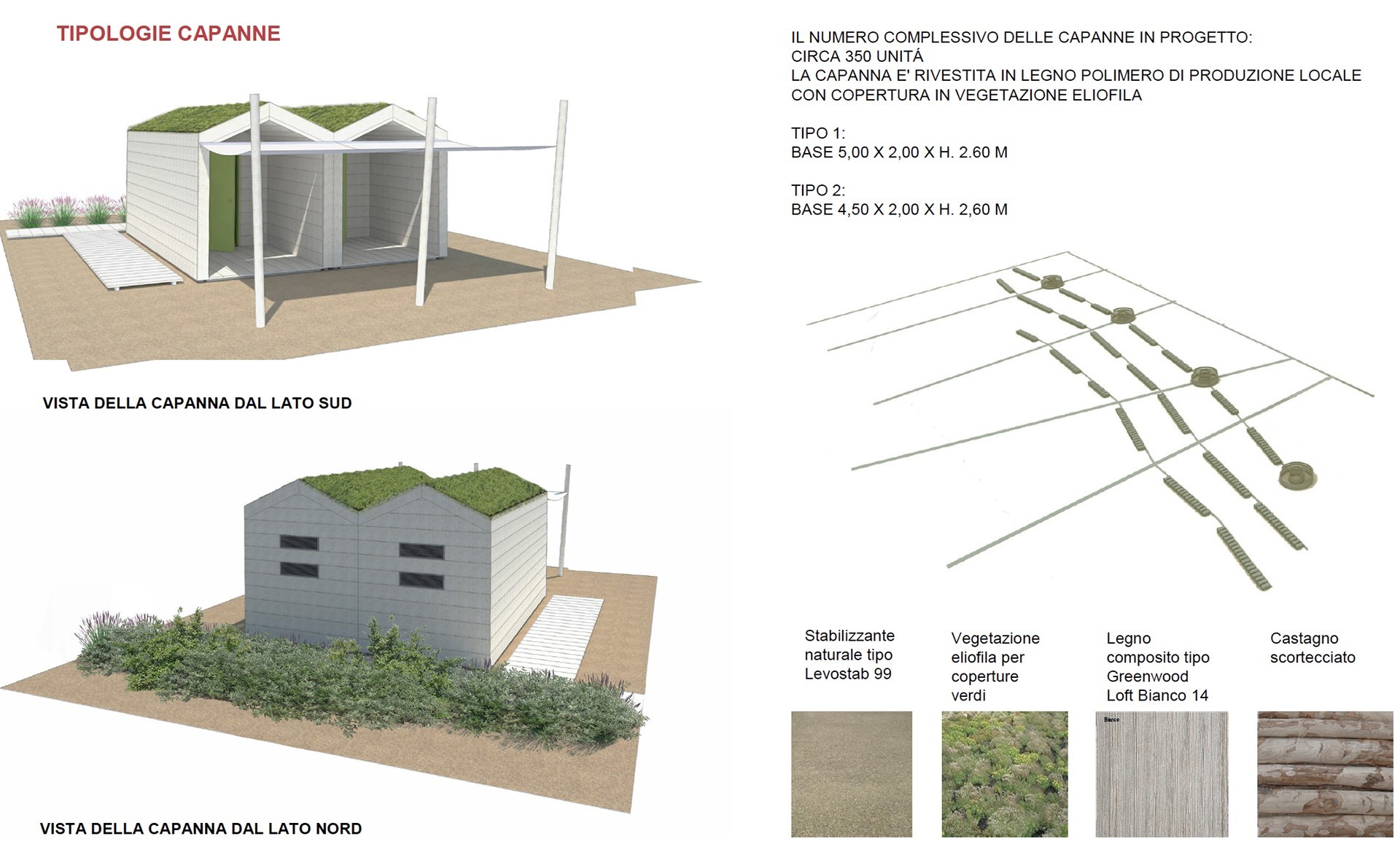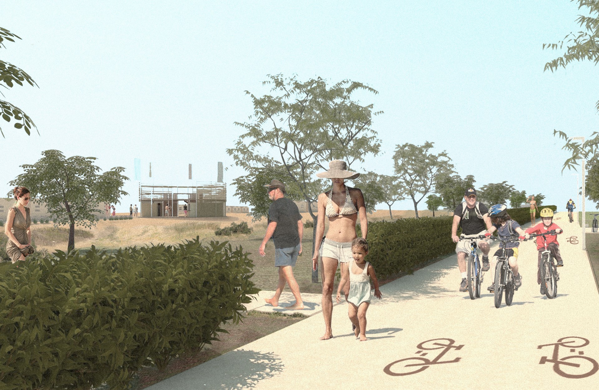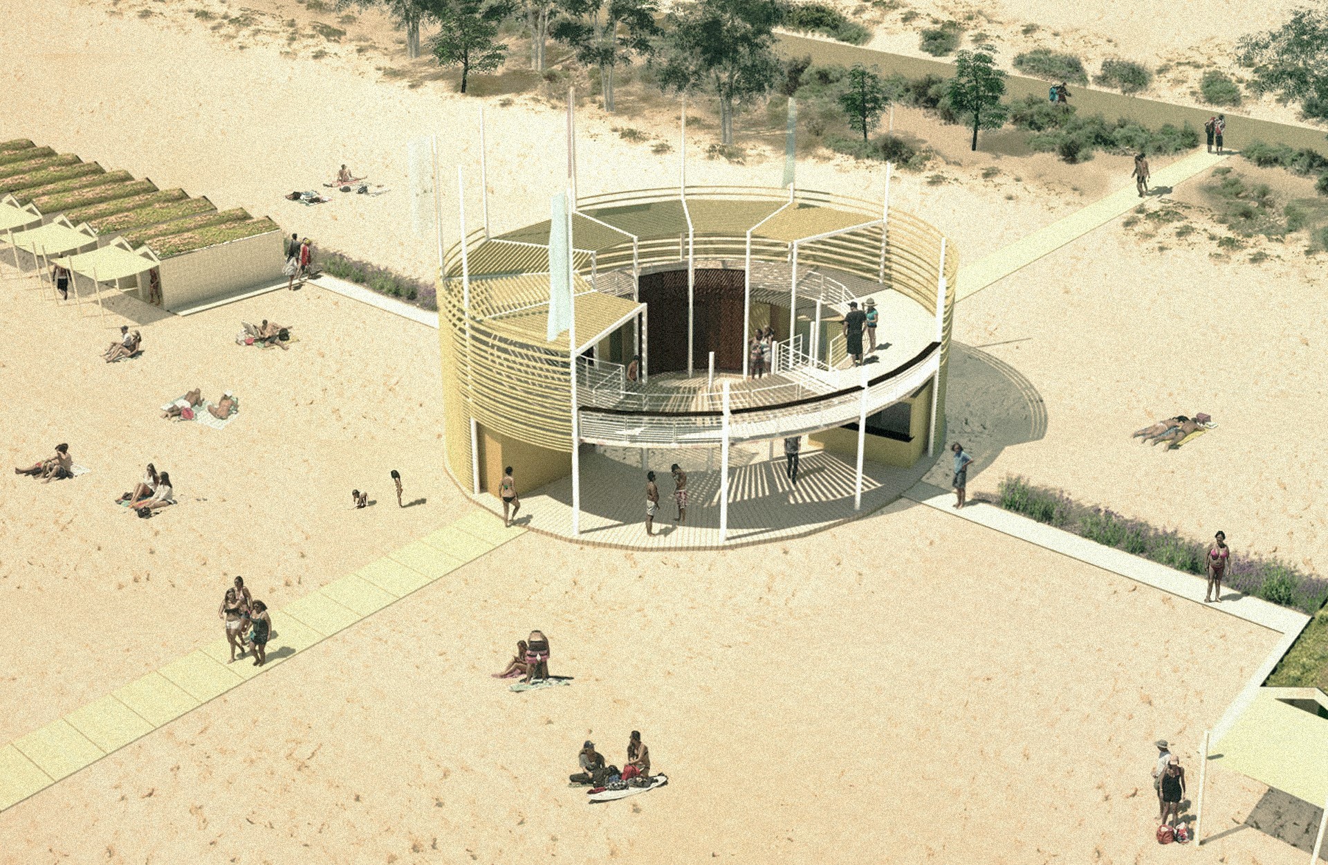 L’impianto planimetrico è caratterizzato da un andamento “fluido” che consente la migliore transizione tra il mare, l’area naturalistica esistente e in progetto e il complesso residenziale e ricettivo previsto sul sedime dell’Ex Ospedale al mare. Per la qualità naturale del luogo è previsto un disegno delle strutture in dotazione alle spiagge che garantisca un basso impatto ambientale, partendo dai percorsi di distribuzione fino ad arrivare alle tipologie di capanne e alle strutture a servizio della spiaggia. È previsto un percorso principale di attraversamento compreso tra i due edifici a servizio della spiaggia (i padiglioni Schio e Marzotto), che si collega con i percorsi trasversali di collegamento alle capanne e al mare.
