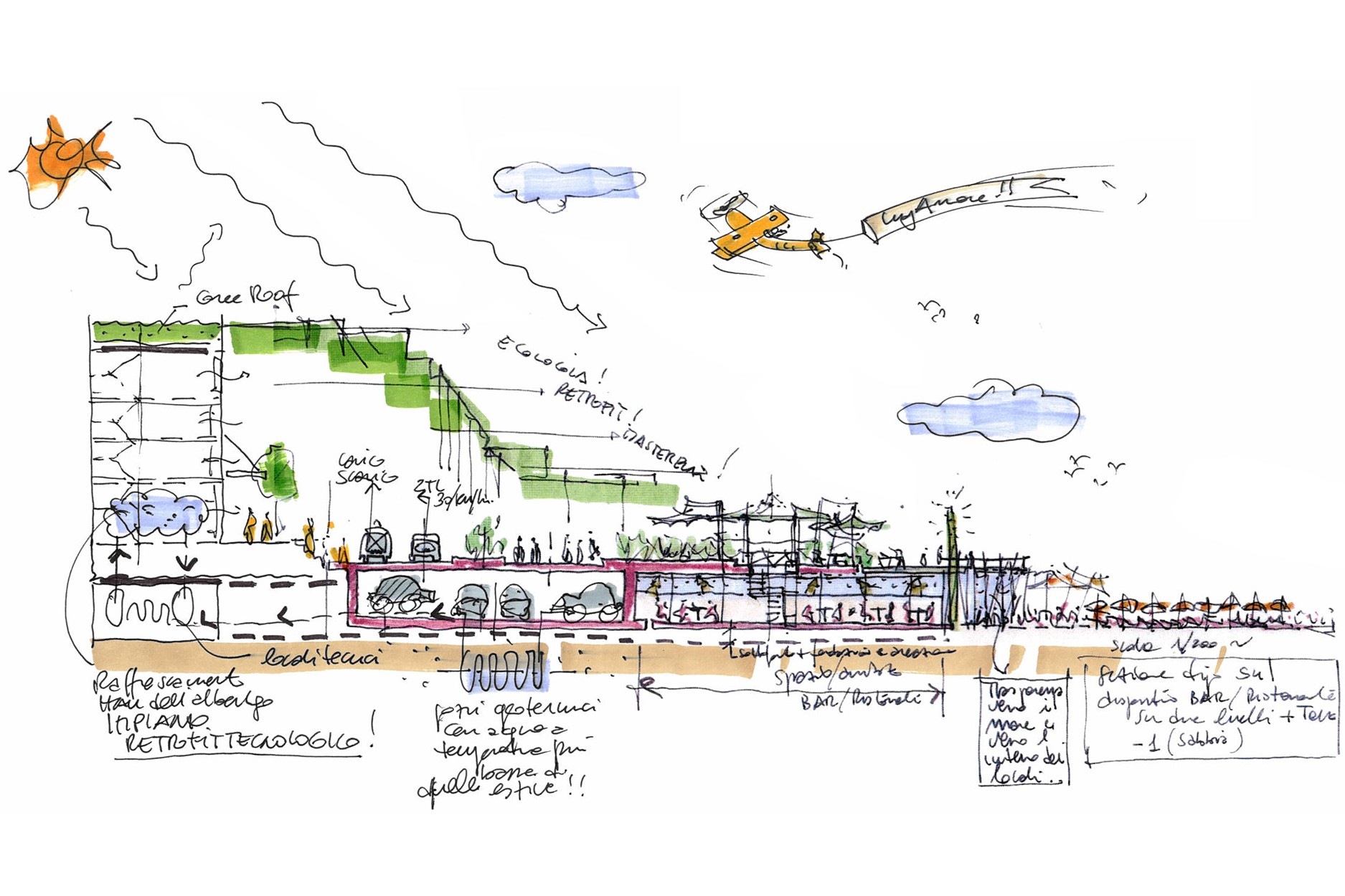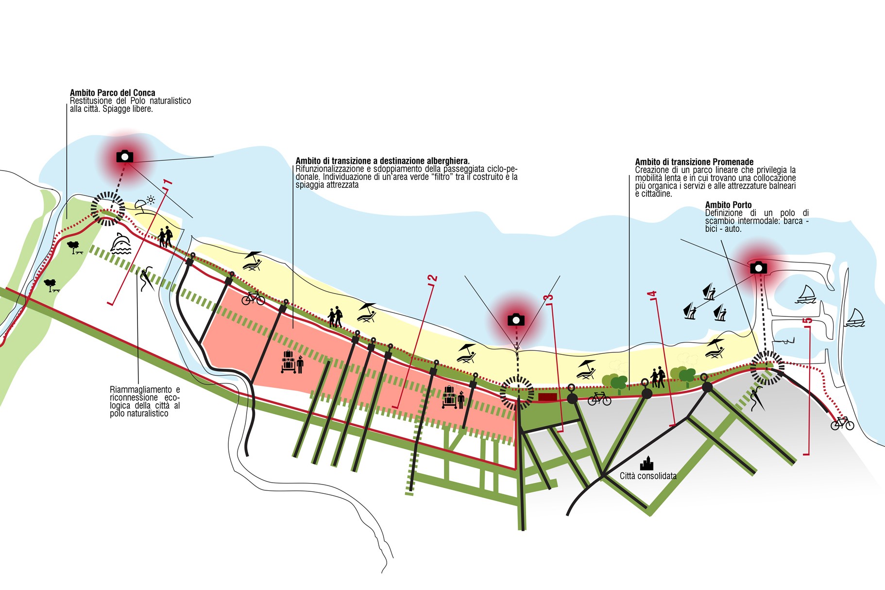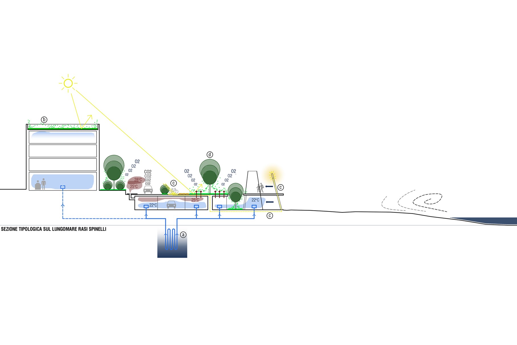 pubblici urbani. L’oggetto del concorso di idee riguarda l’ambito urbano e ambientale costituito dal Lungomare Rasi- Spinelli e dalle aree su di esso gravitanti sia funzionalmente che paesaggisticamente. Il masterplan si propone quale dispositivo incentrato sul paradigma dell’eco-tecnologia urbana multilivello (che tratta congiuntamente gli aspetti sociologici, urbanistici, economici). La prima fase del concorso prevedeva una esposizione dei progetti e la consultazione della cittadinanza per mezzo di quesiti che sono poi stati raccolti in un “Quaderno di lavoro” che è servito come base per sviluppare i 5 progetti ammessi alla seconda fase della gara.