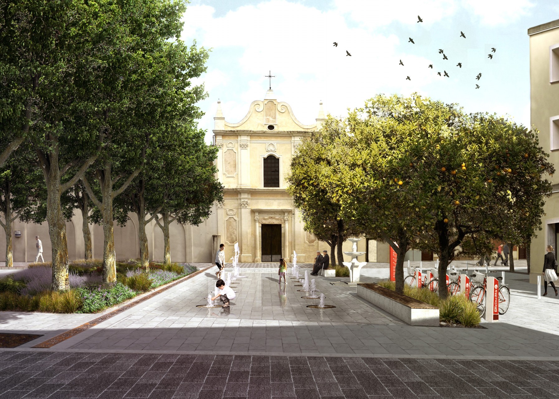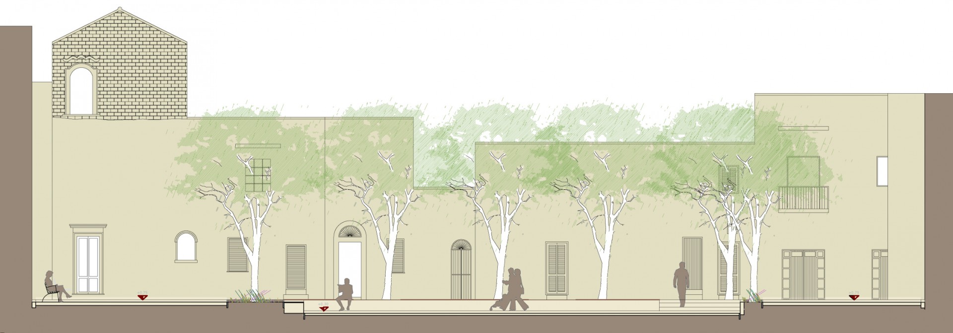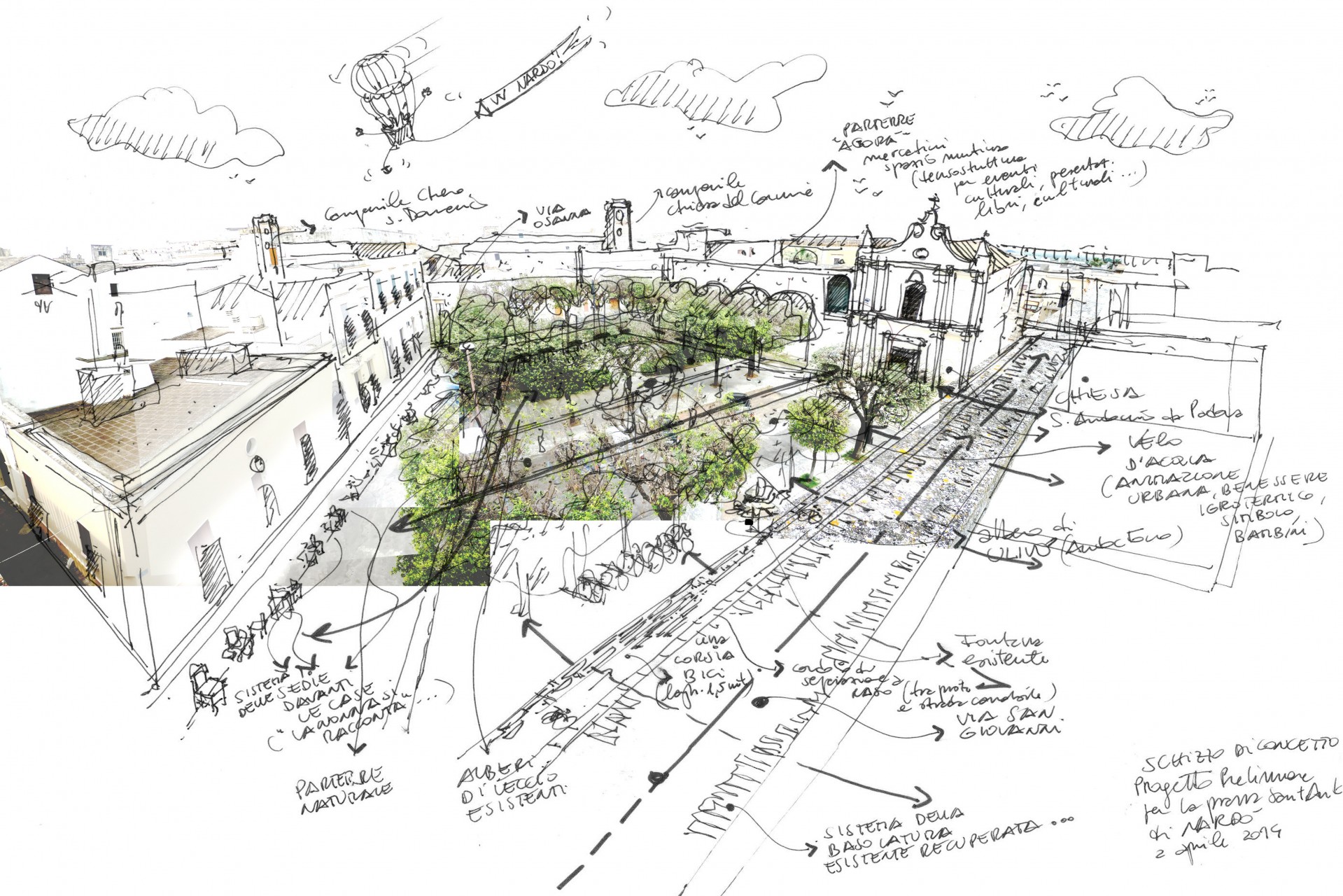 Il progetto tende a ricostruire i rapporti dell’antica città storica tra i pieni e i vuoti e rende leggibili gli antichi assetti viari, in cui il sistema delle piccole corti interne che si sviluppano segretamente tra gli edifici abitativi è ricreato con le chiome degli alberi che delimitano la percezione dell’intero vuoto e offrono alla comunità locale un luogo d’incontro, di aggregazione e di meditazione a seconda dei momenti della giornata.