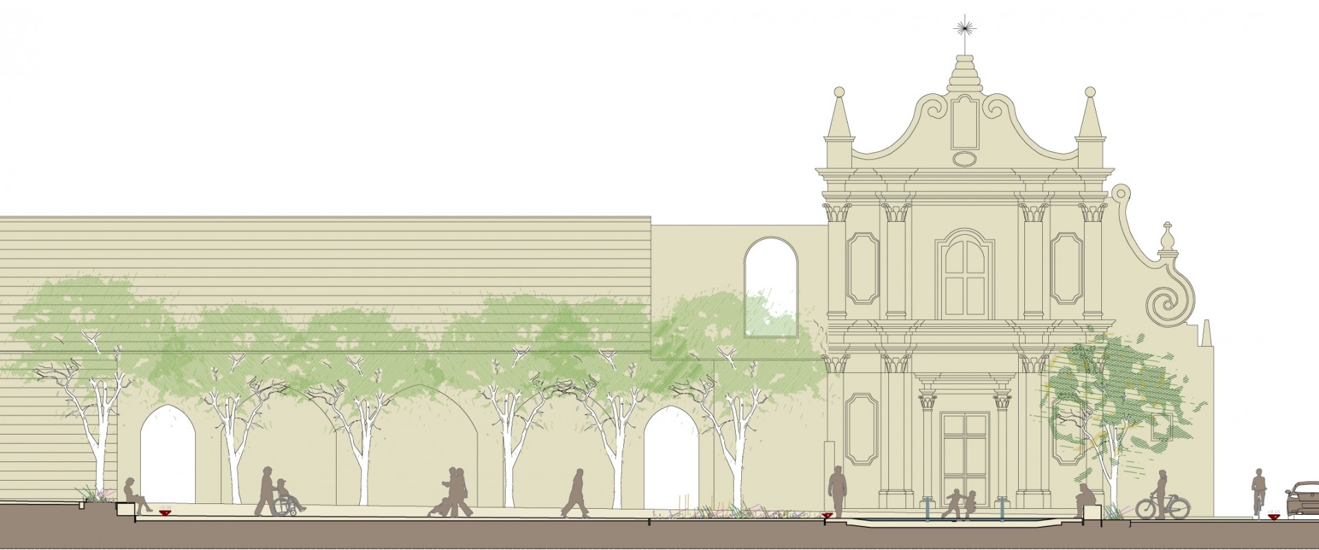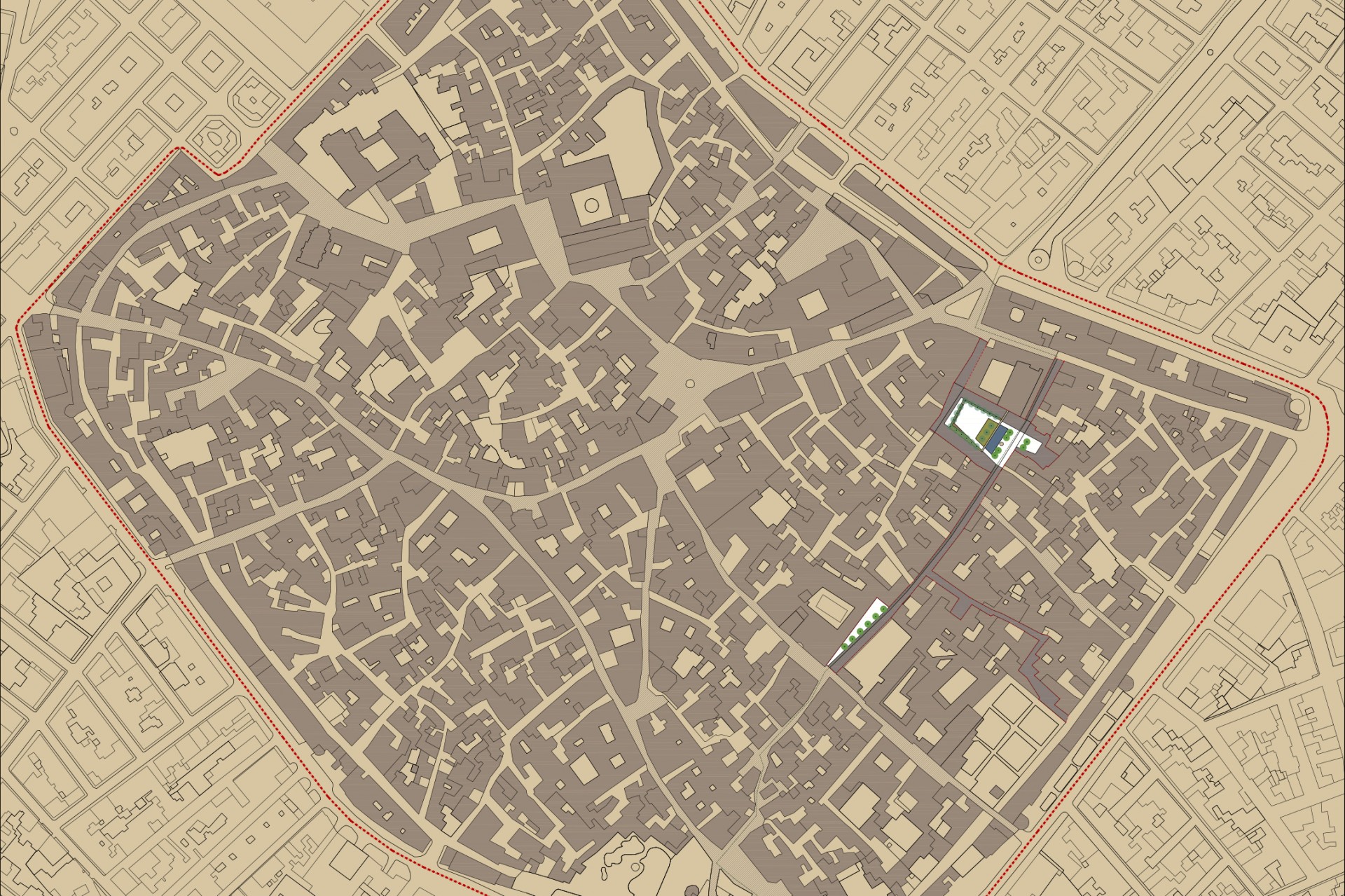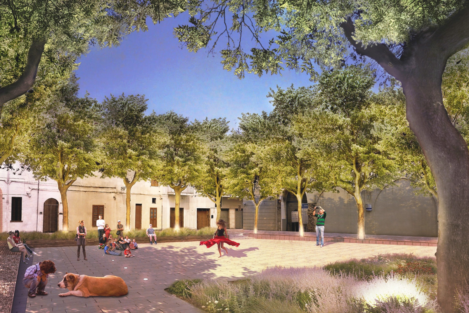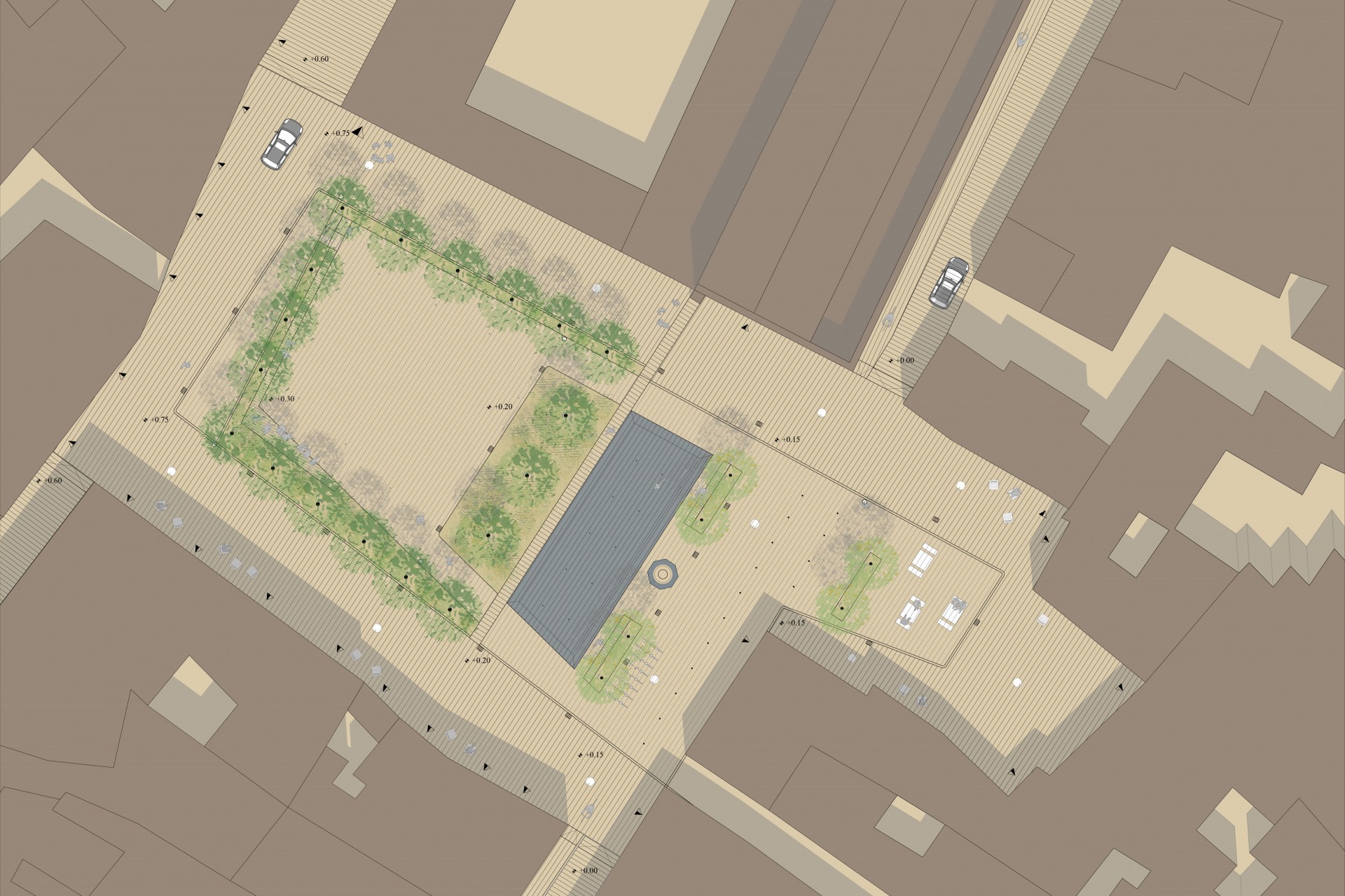 Il progetto tende a ricostruire i rapporti dell’antica città storica tra i pieni e i vuoti e rende leggibili gli antichi assetti viari, in cui il sistema delle piccole corti interne che si sviluppano segretamente tra gli edifici abitativi è ricreato con le chiome degli alberi che delimitano la percezione dell’intero vuoto e offrono alla comunità locale un luogo d’incontro, di aggregazione e di meditazione a seconda dei momenti della giornata.