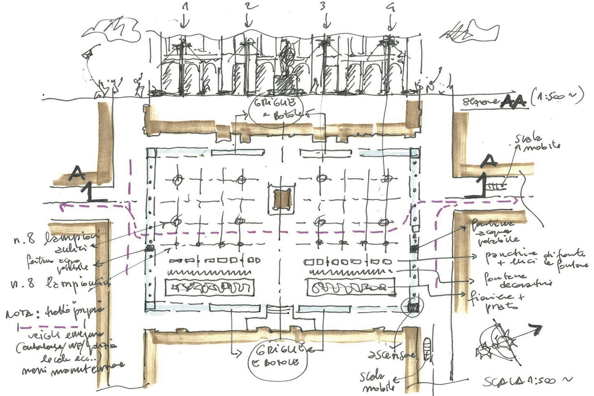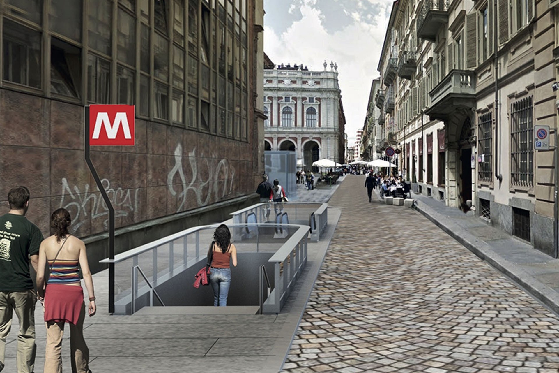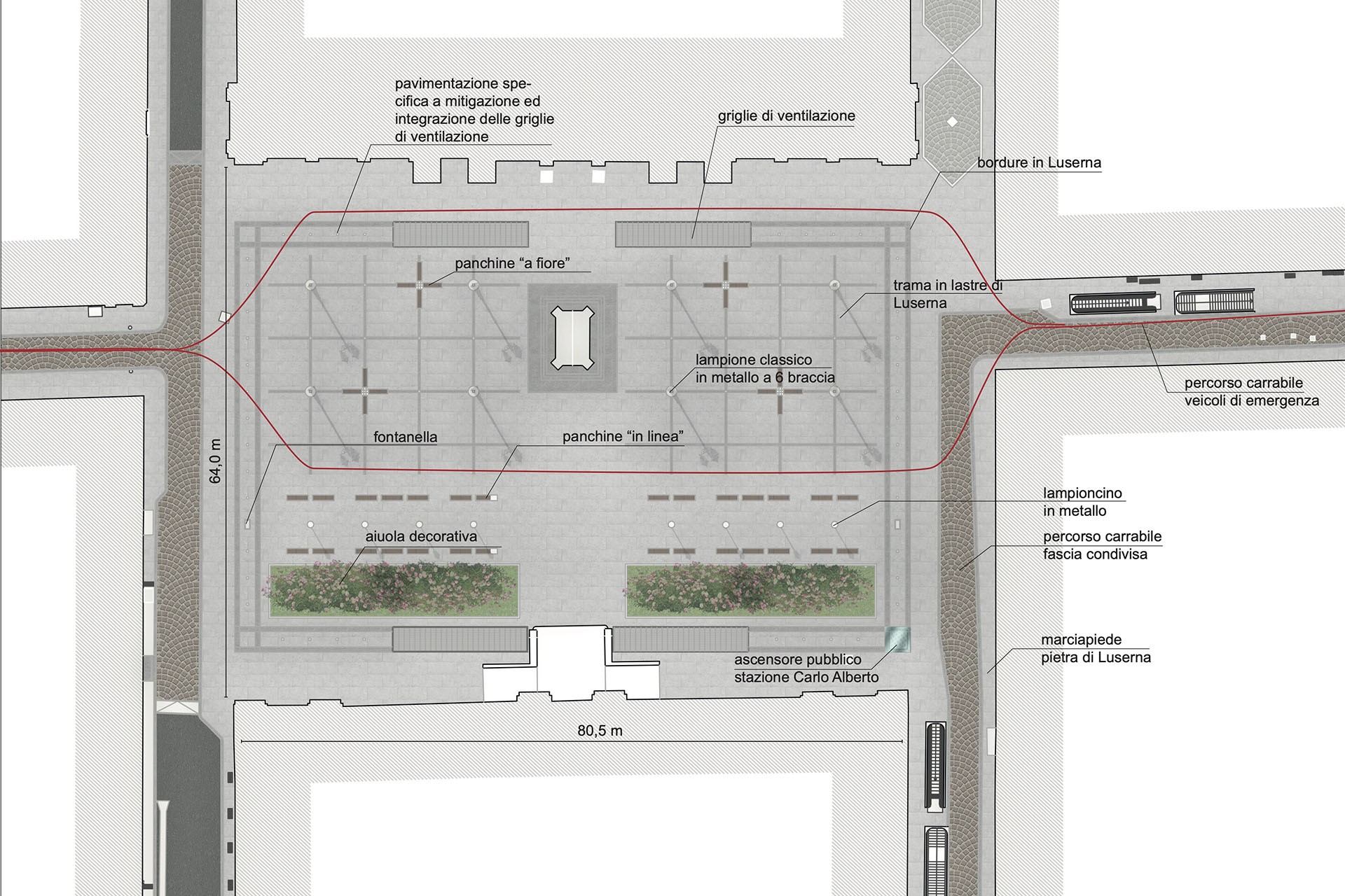 La stazione Carlo Alberto della linea 2 della Metropolitana di Torino, si colloca nei pressi dell’omonima piazza, cuore della città di Torino ed in posizione baricentrica del centro storico. L’area è già̀ parte di un sistema di percorsi pedonali che coprono le principali vie del centro, ed è in prossimità̀ di grandi istituzioni culturali come il Palazzo Reale ed i suoi Musei, il Museo Egizio di Torino, Palazzo Carignano e la Biblioteca Nazionale. La stazione insiste su un’area del centro che necessità il più̀ grande rispetto per il suo contesto storico ed aulico. Gli impianti e le cosiddette “emergenze di stazione “saranno collocati infatti al di fuori dell’invaso geometrico della piazza, così da preservarne il patrimonio architettonico. La stazione sarà̀ destinata al servizio del centro storico, avendo grande potenziale come “stazione-museo”, esempio già̀ seguito da diverse altre città europee (es Napoli) così da renderla polo di attrazione in sé per turisti e cittadini. Il nuovo intervento di stazione permetterà̀ anche un ridisegno della piazza, in modo da ottenere una nuova simmetria dello spazio pubblico urbano con al centro la statua equestre del Re Carlo Alberto ed un nuovo spazio verde.