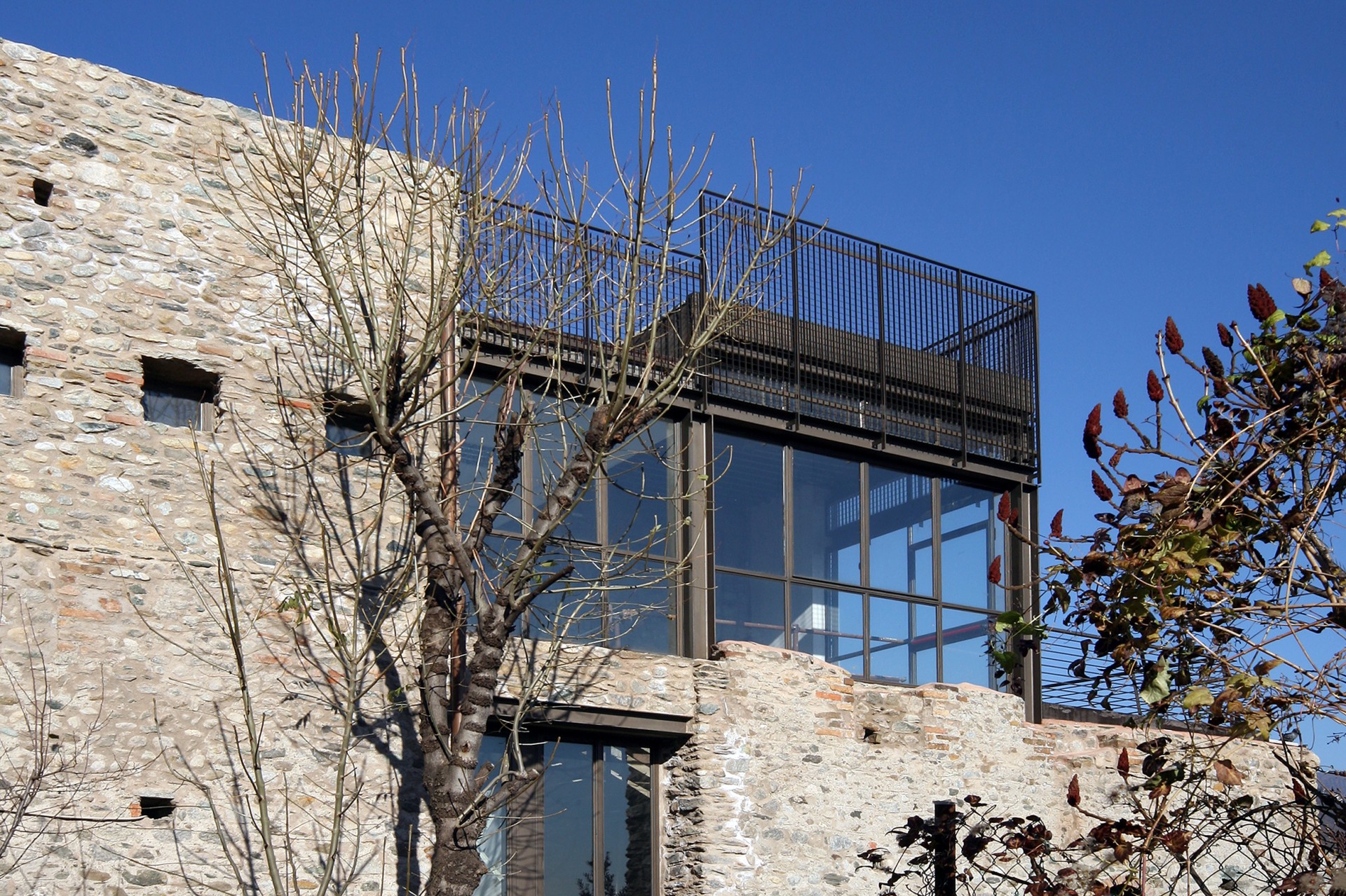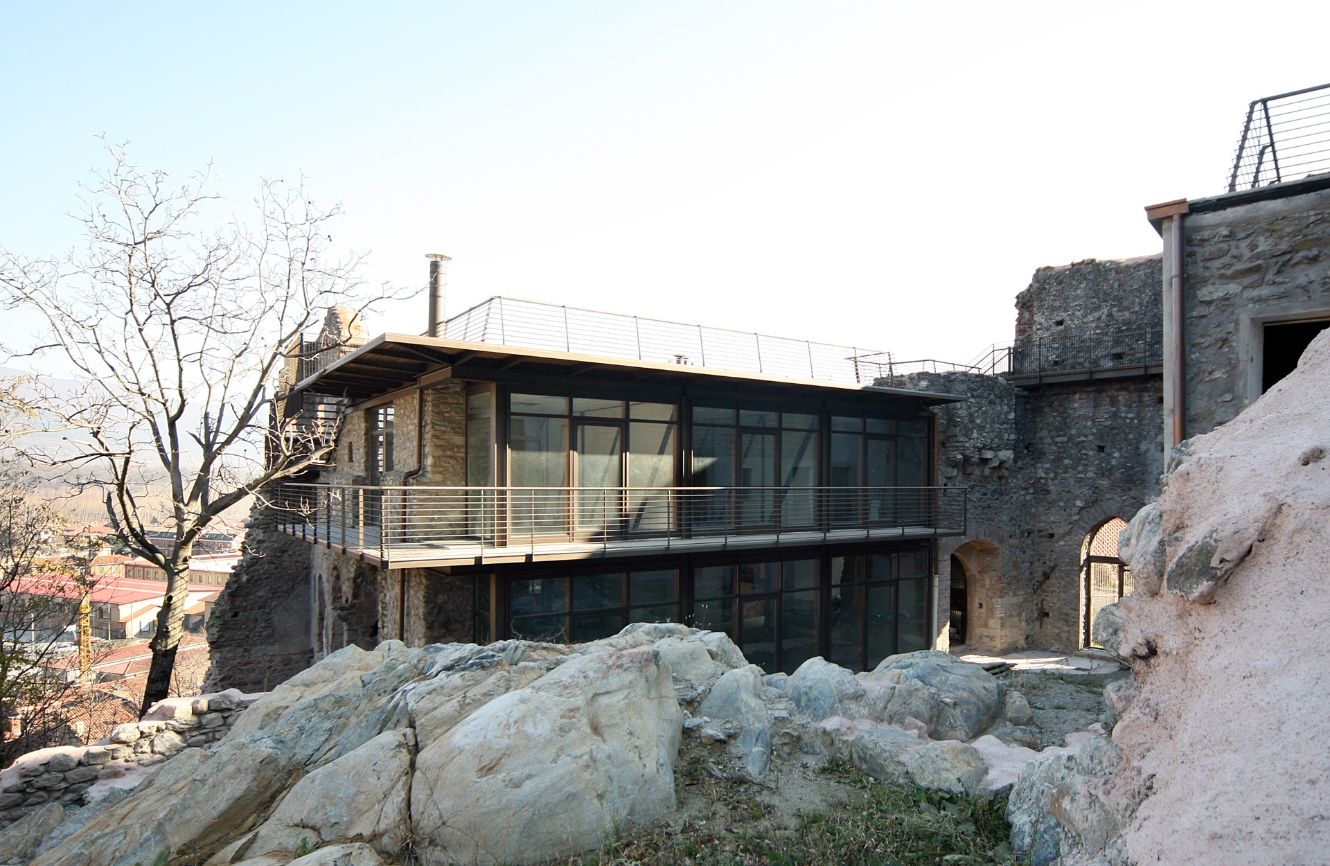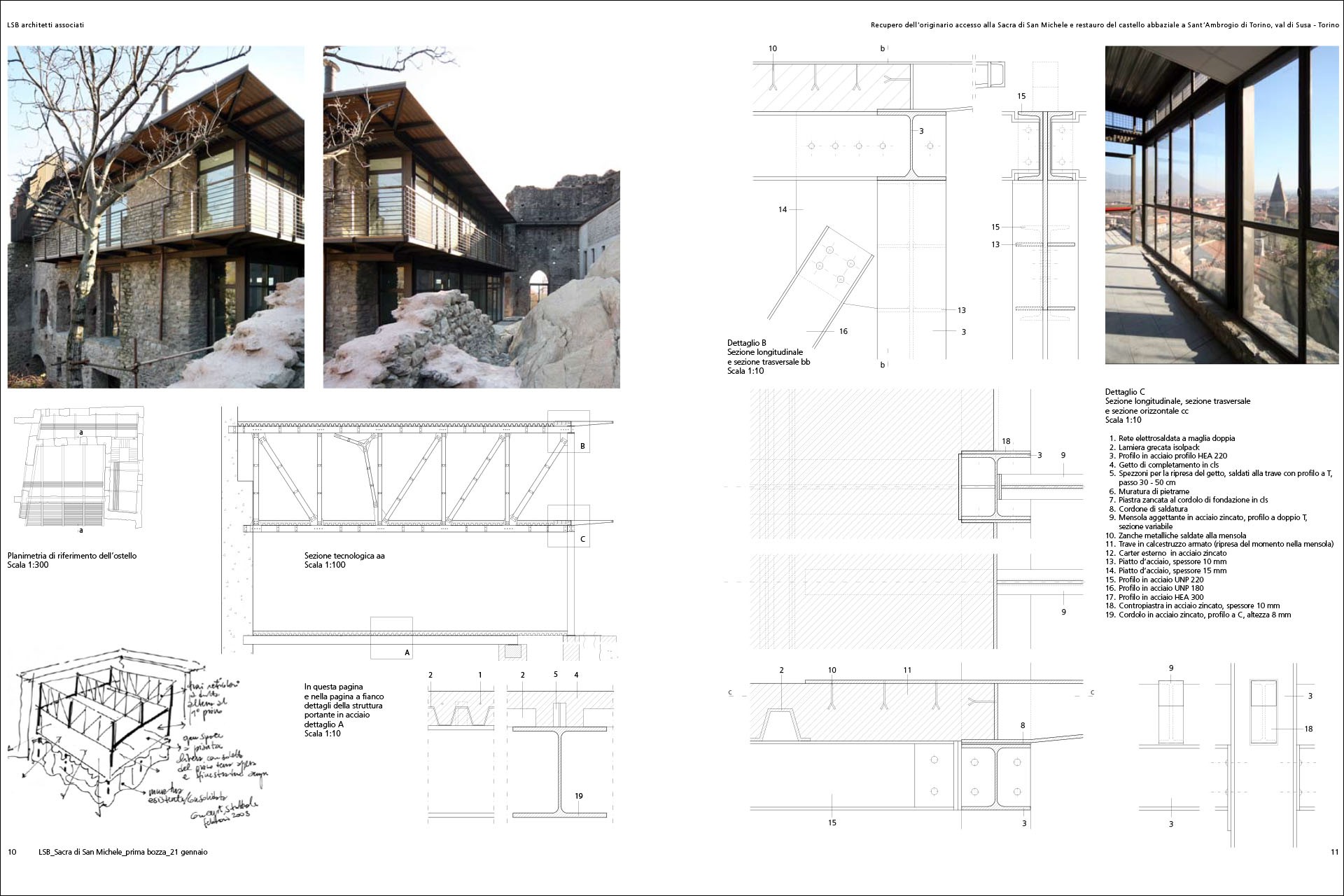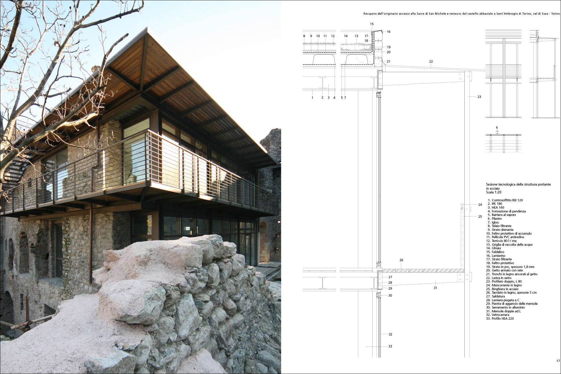 Il progetto di rifunzionalizzazione e restauro del castello abbaziale di sant’Ambrogio si inserisce nel sistema originario dei percorsi di accesso alla Sacra di San Michele (l’edificio simbolo della Regione Piemonte). La struttura si sviluppa su tre livelli ed è concepita per accogliere fino a una cinquantina di ospiti. L’edificio è costituito da un’ossatura portante in acciaio (intervento di tipo reversibile a cui è demandata anche la funzione di controventamento orizzontale e verticale per le murature ancora emergenti); i tamponamenti esterni sono costituiti da pareti vetrate, in grado di inserirsi con il minor impatto nel perimetro delle murature esistenti e contemporaneamente sfruttare al massimo il soleggiamento; il terrazzo sulla copertura esalta la visione verso la valle di Susa e permette di fruire del recuperato percorso di ronda dell’antico manufatto medievale. Questa struttura si pone quale tappa e rifugio per i pellegrini della storica Via Francigena.