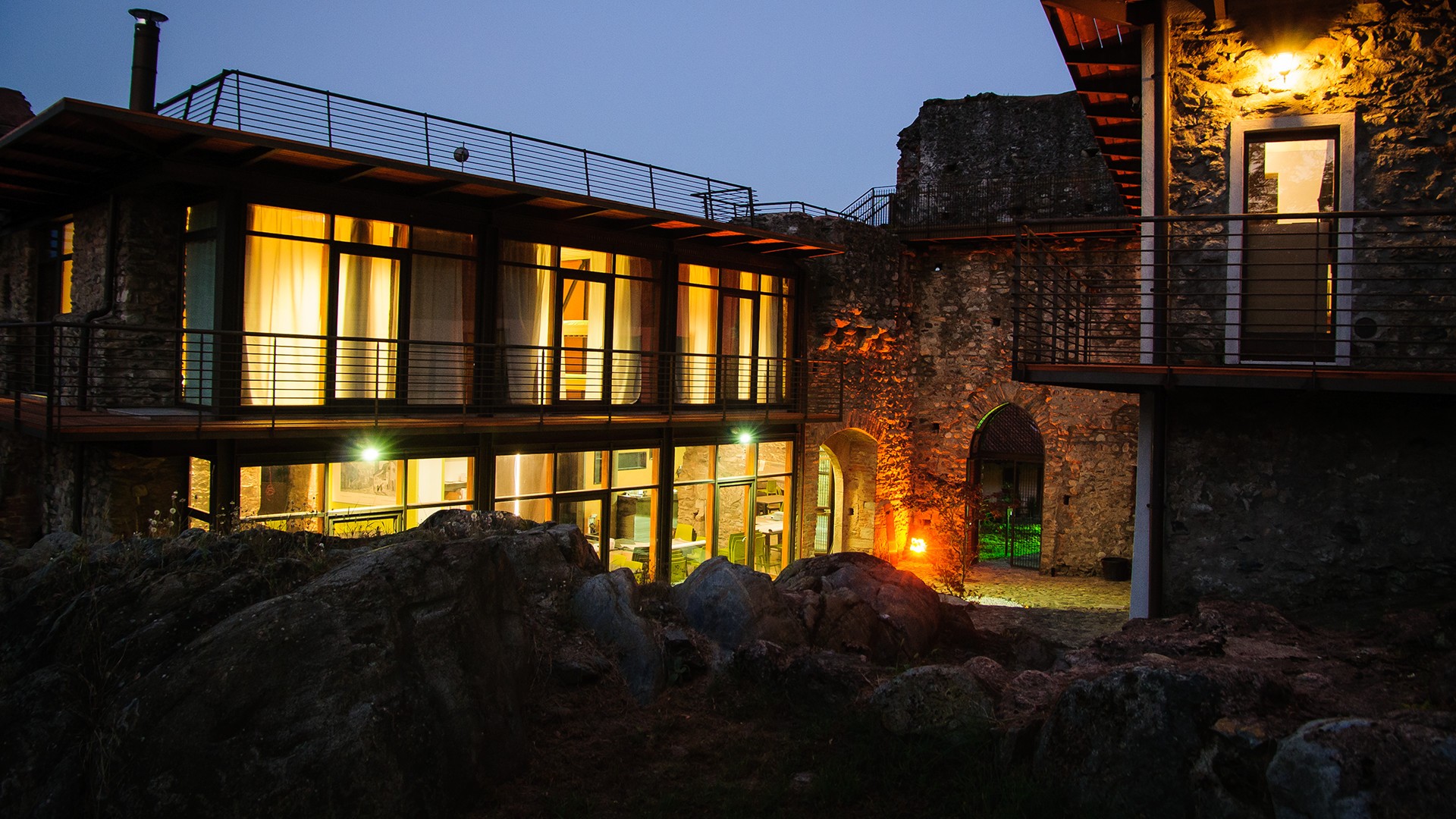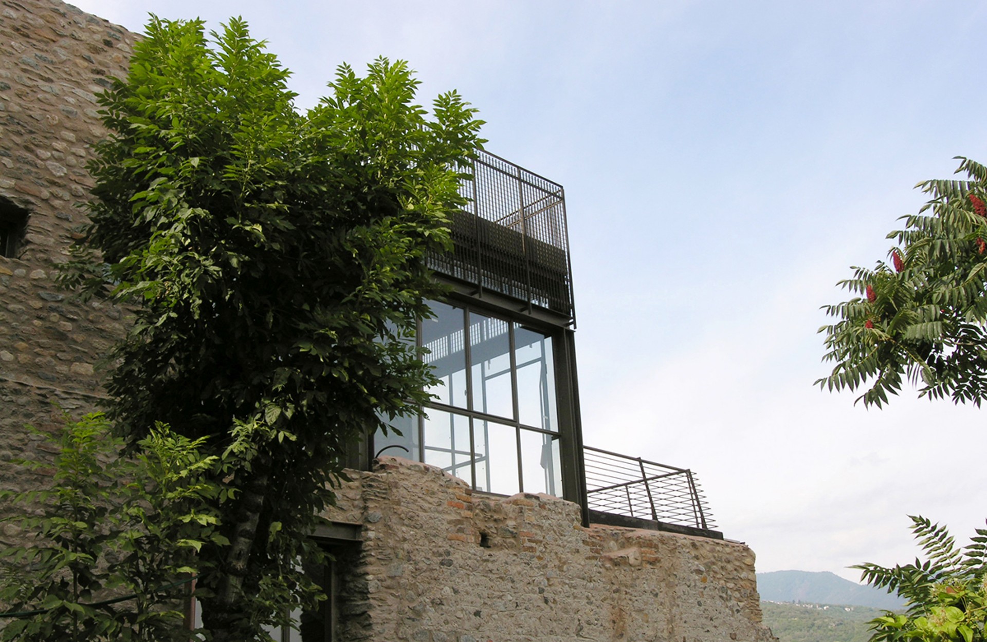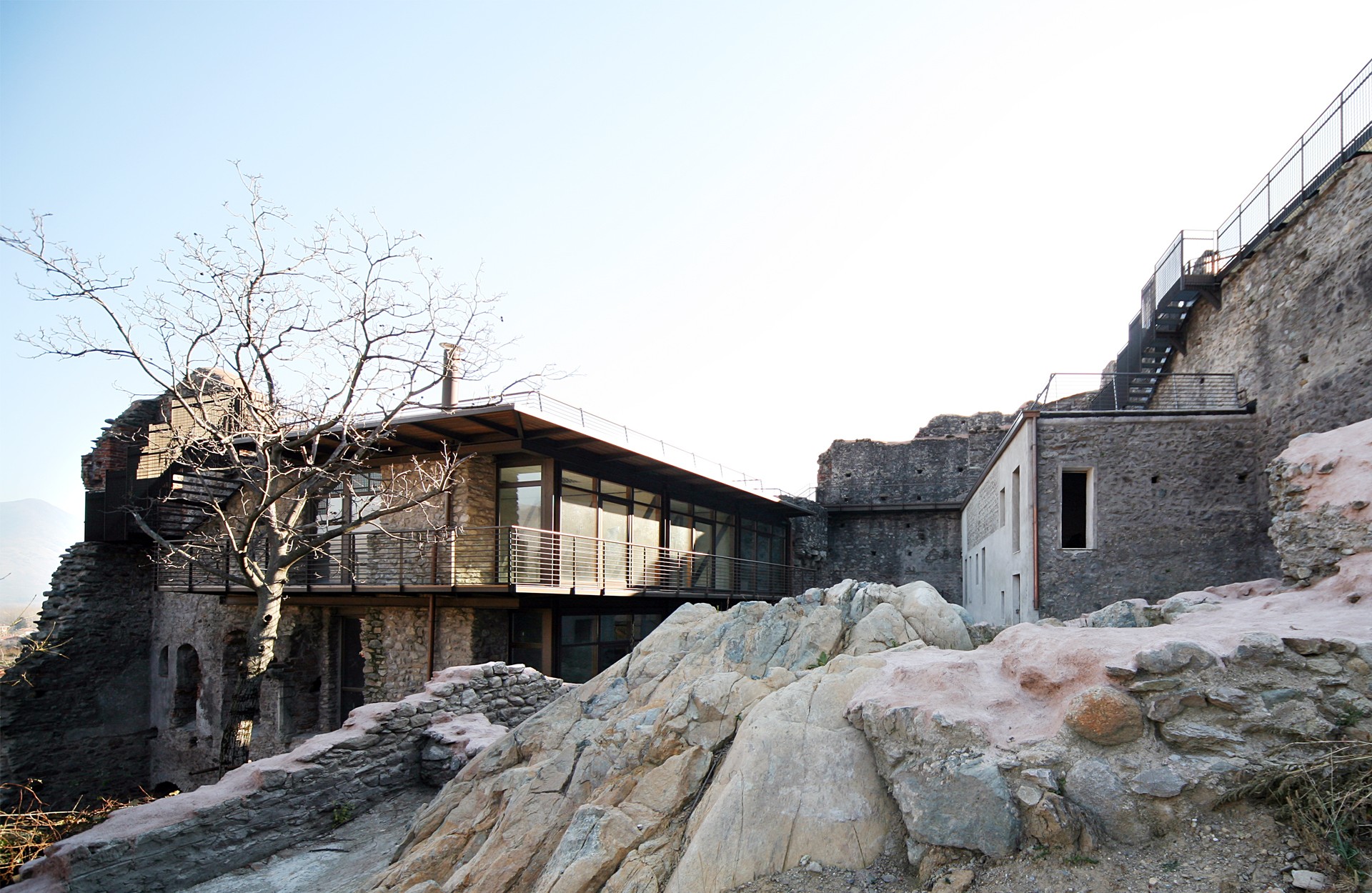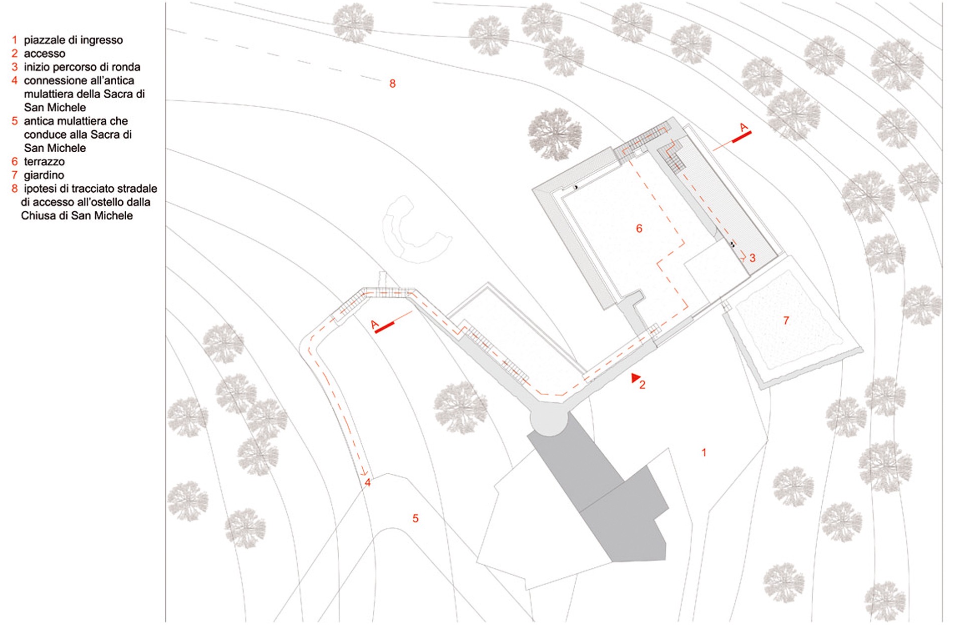 Il progetto di rifunzionalizzazione e restauro del castello abbaziale di sant’Ambrogio si inserisce nel sistema originario dei percorsi di accesso alla Sacra di San Michele (l’edificio simbolo della Regione Piemonte). La struttura si sviluppa su tre livelli ed è concepita per accogliere fino a una cinquantina di ospiti. L’edificio è costituito da un’ossatura portante in acciaio (intervento di tipo reversibile a cui è demandata anche la funzione di controventamento orizzontale e verticale per le murature ancora emergenti); i tamponamenti esterni sono costituiti da pareti vetrate, in grado di inserirsi con il minor impatto nel perimetro delle murature esistenti e contemporaneamente sfruttare al massimo il soleggiamento; il terrazzo sulla copertura esalta la visione verso la valle di Susa e permette di fruire del recuperato percorso di ronda dell’antico manufatto medievale. Questa struttura si pone quale tappa e rifugio per i pellegrini della storica Via Francigena.