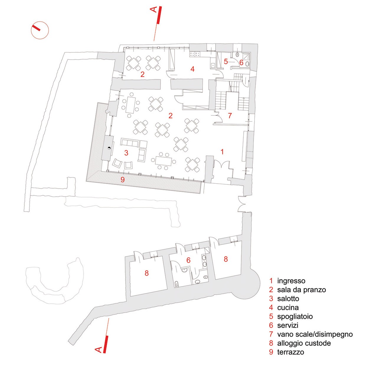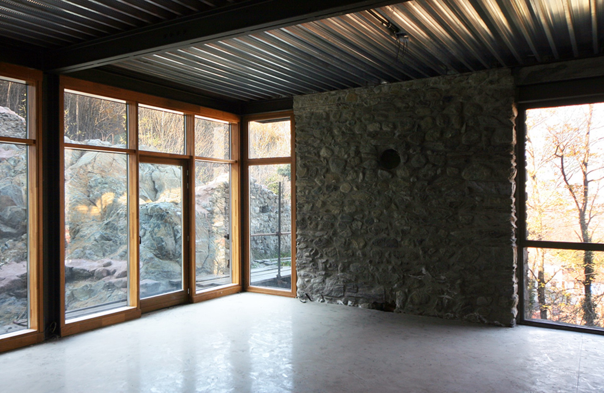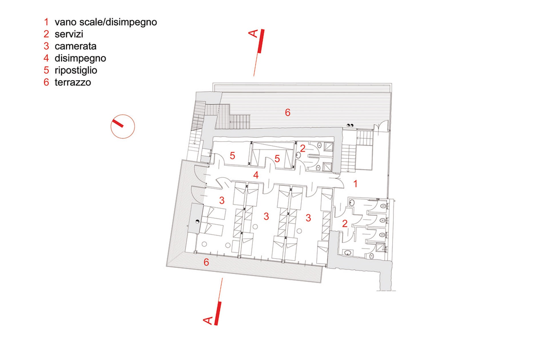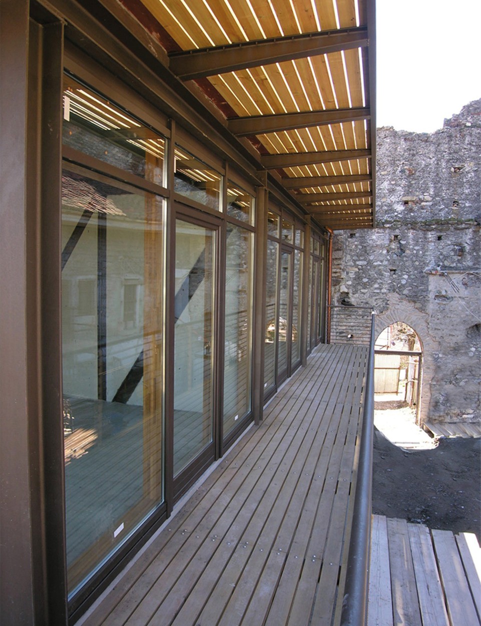 Il progetto di rifunzionalizzazione e restauro del castello abbaziale di sant’Ambrogio si inserisce nel sistema originario dei percorsi di accesso alla Sacra di San Michele (l’edificio simbolo della Regione Piemonte). La struttura si sviluppa su tre livelli ed è concepita per accogliere fino a una cinquantina di ospiti. L’edificio è costituito da un’ossatura portante in acciaio (intervento di tipo reversibile a cui è demandata anche la funzione di controventamento orizzontale e verticale per le murature ancora emergenti); i tamponamenti esterni sono costituiti da pareti vetrate, in grado di inserirsi con il minor impatto nel perimetro delle murature esistenti e contemporaneamente sfruttare al massimo il soleggiamento; il terrazzo sulla copertura esalta la visione verso la valle di Susa e permette di fruire del recuperato percorso di ronda dell’antico manufatto medievale. Questa struttura si pone quale tappa e rifugio per i pellegrini della storica Via Francigena.