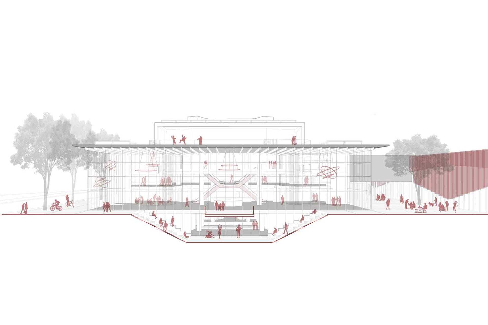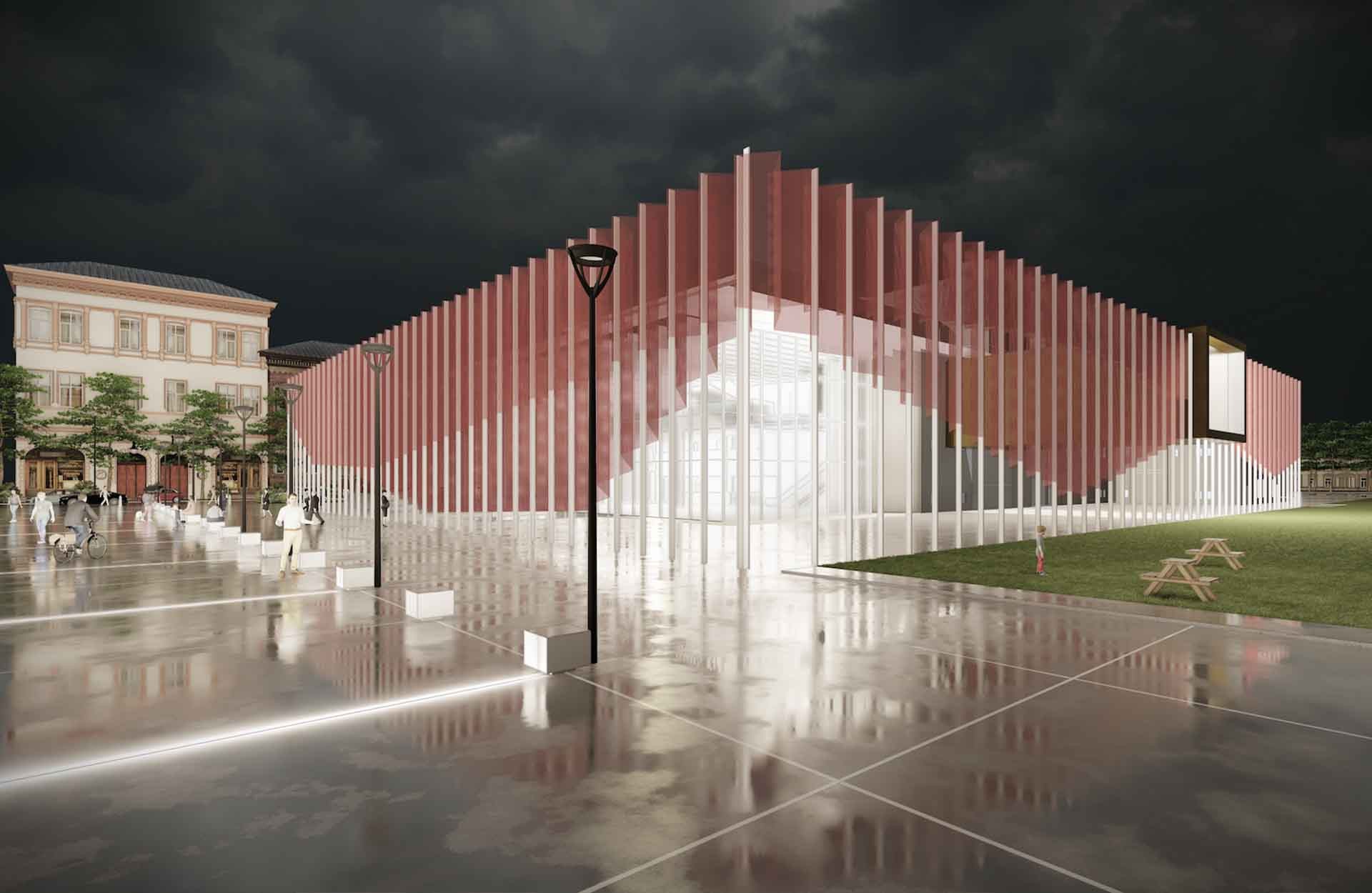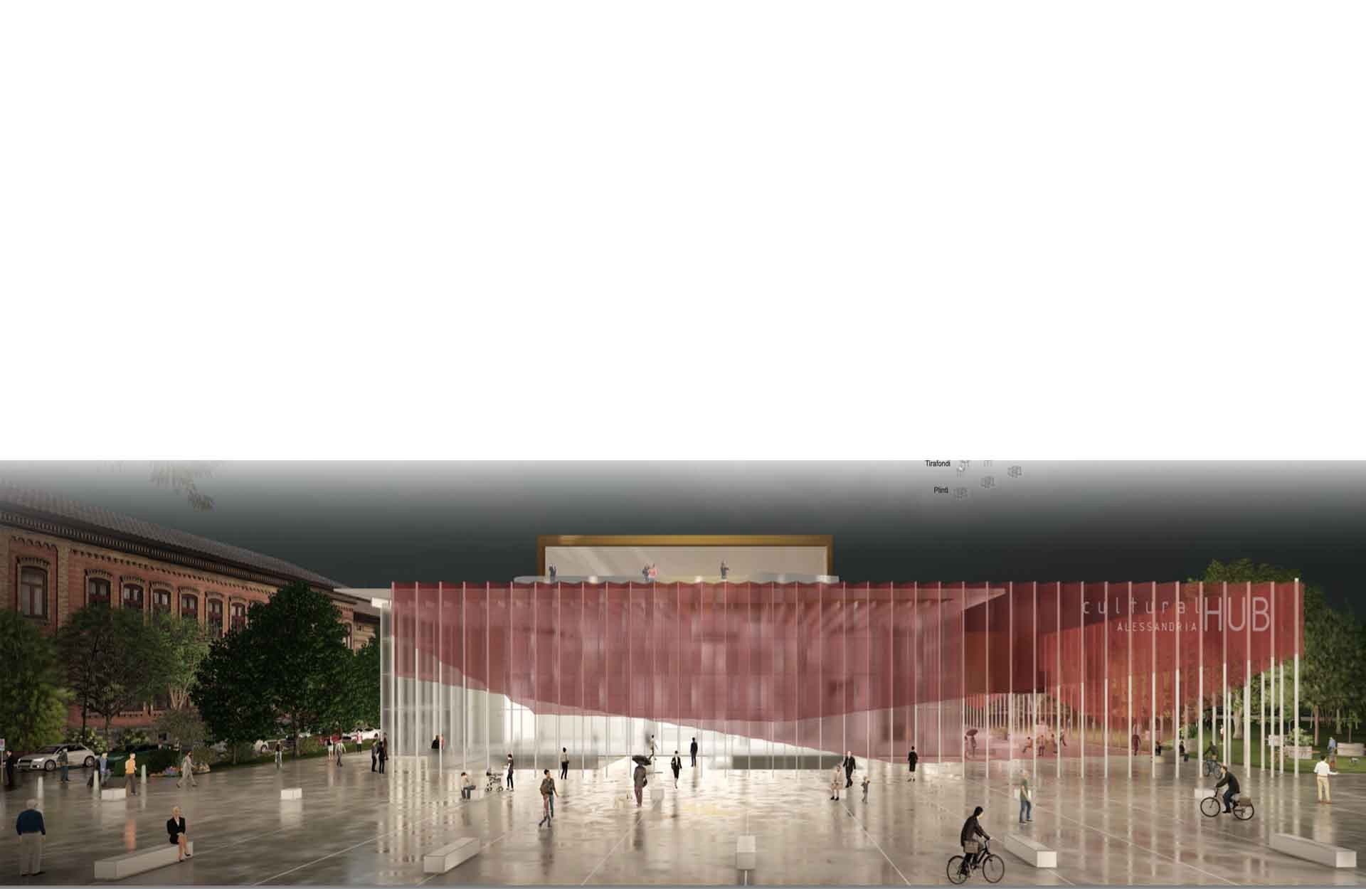 Il progetto di rifunzionalizzazione del Teatro Comunale di Alessandria come nuovo "Hub" della cultura e del turismo del territorio si pone l'obiettivo di instaurare tra il pubblico e gli artisti e con gli utenti in generale relazioni più orizzontali e meno codificate rispetto a quanto accade per la fruizione degli spettacoli in un teatro convenzionale. La quinta esterna rappresenta un elemento simbolico di transizione tra la città e l’interno dell’edificio definendo uno spazio “filtro” che ricorda i tradizionali portici dei teatri storici italiani