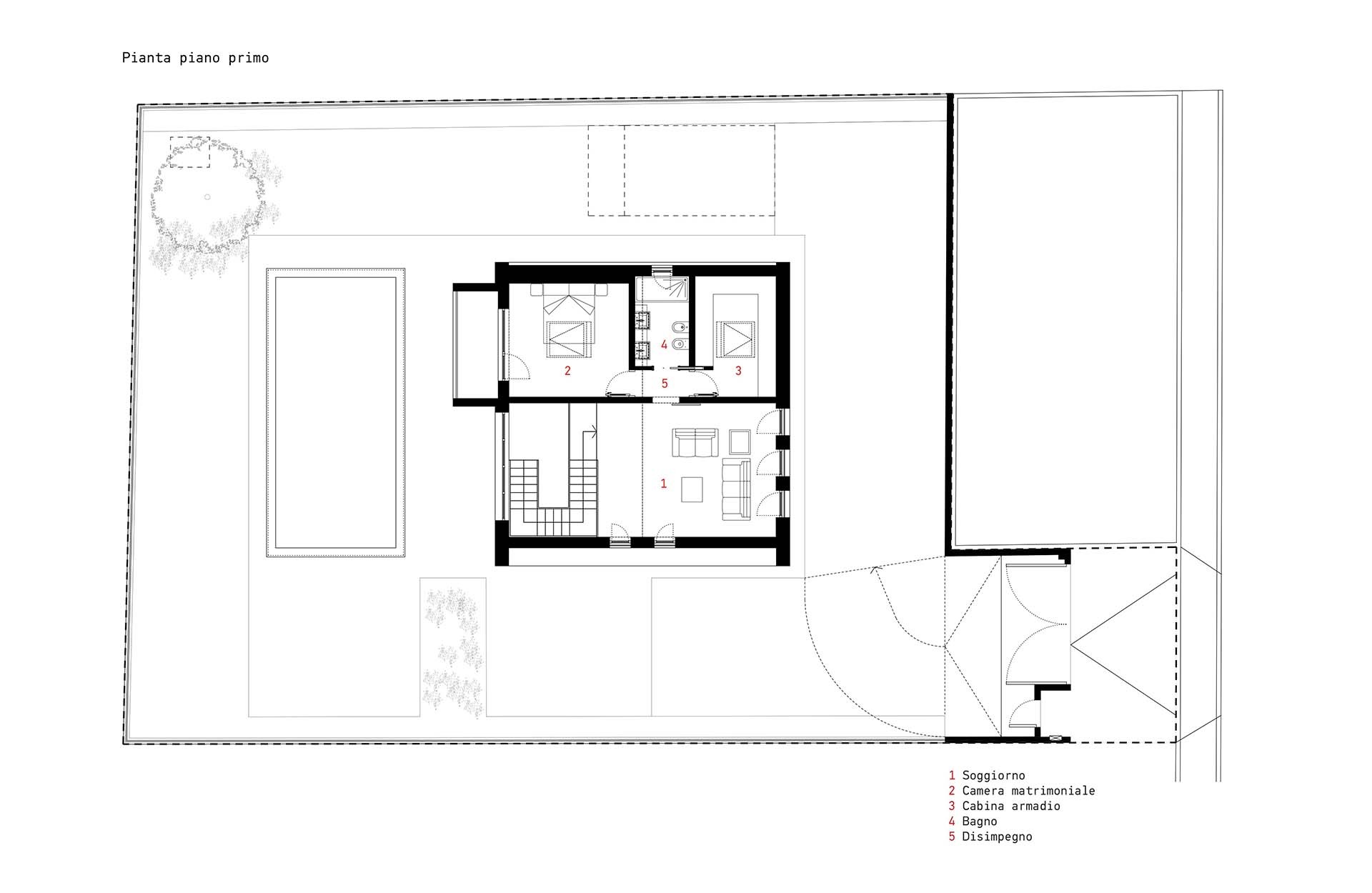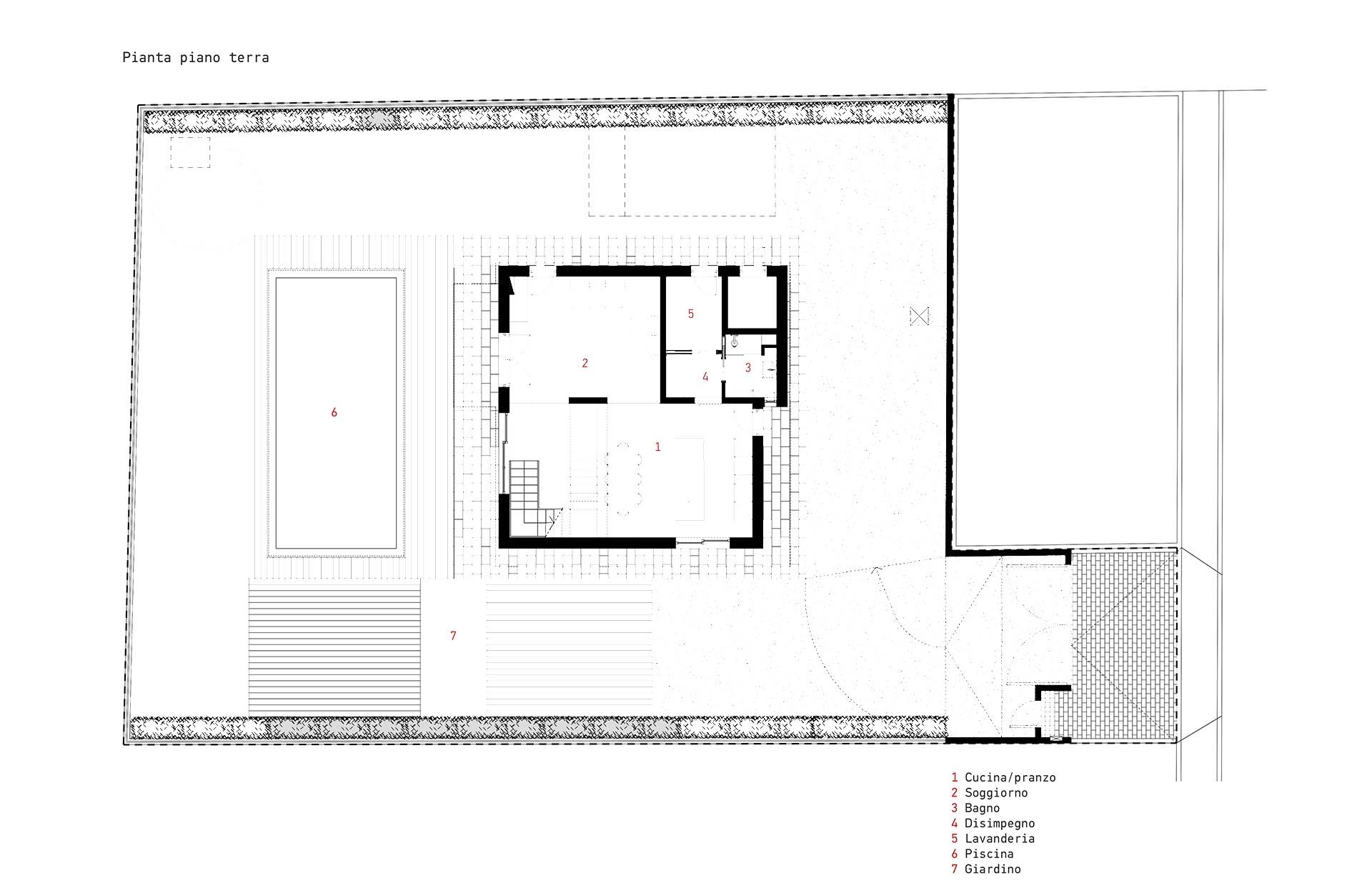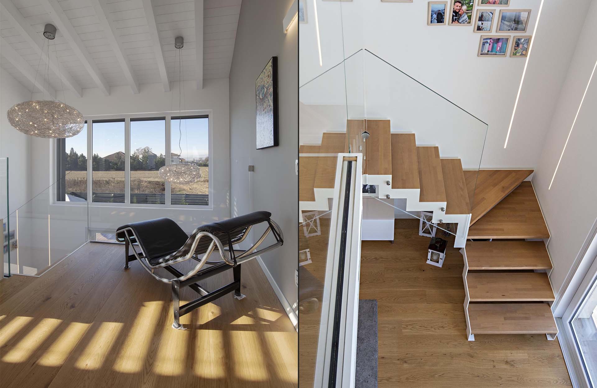 L’abitazione si sviluppa su due piani ed è caratterizzata da un luminoso soggiorno a doppia altezza in cui la scala scenografica, che conduce alle camere del primo piano, permette la completa percezione dei volumi e la apre alla vista suggestiva del territorio circostante. La casa si caratterizza per la notevole compattezza dei volumi e per la sostanziale opacità delle pareti a cui fa da contraltare la totale apertura del fronte Ovest e Sud: un equilibrio tra la volontà di rendere la casa estremamente efficiente a livello energetico e il desiderio di percepire il cambio delle stagioni, di captare e di modulare la luce solare durante tutto l’anno e di godere della vista del giardino e della piscina.