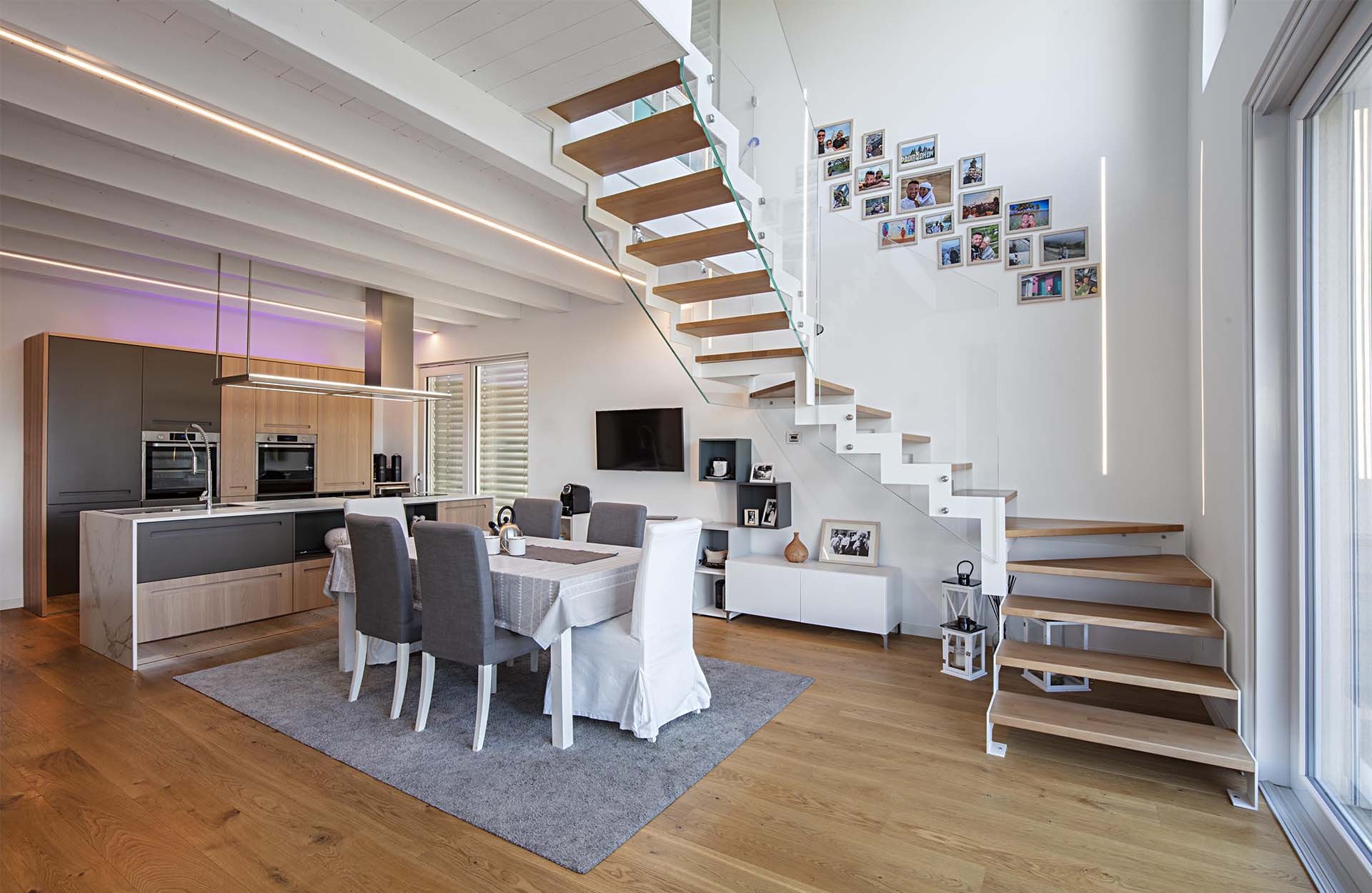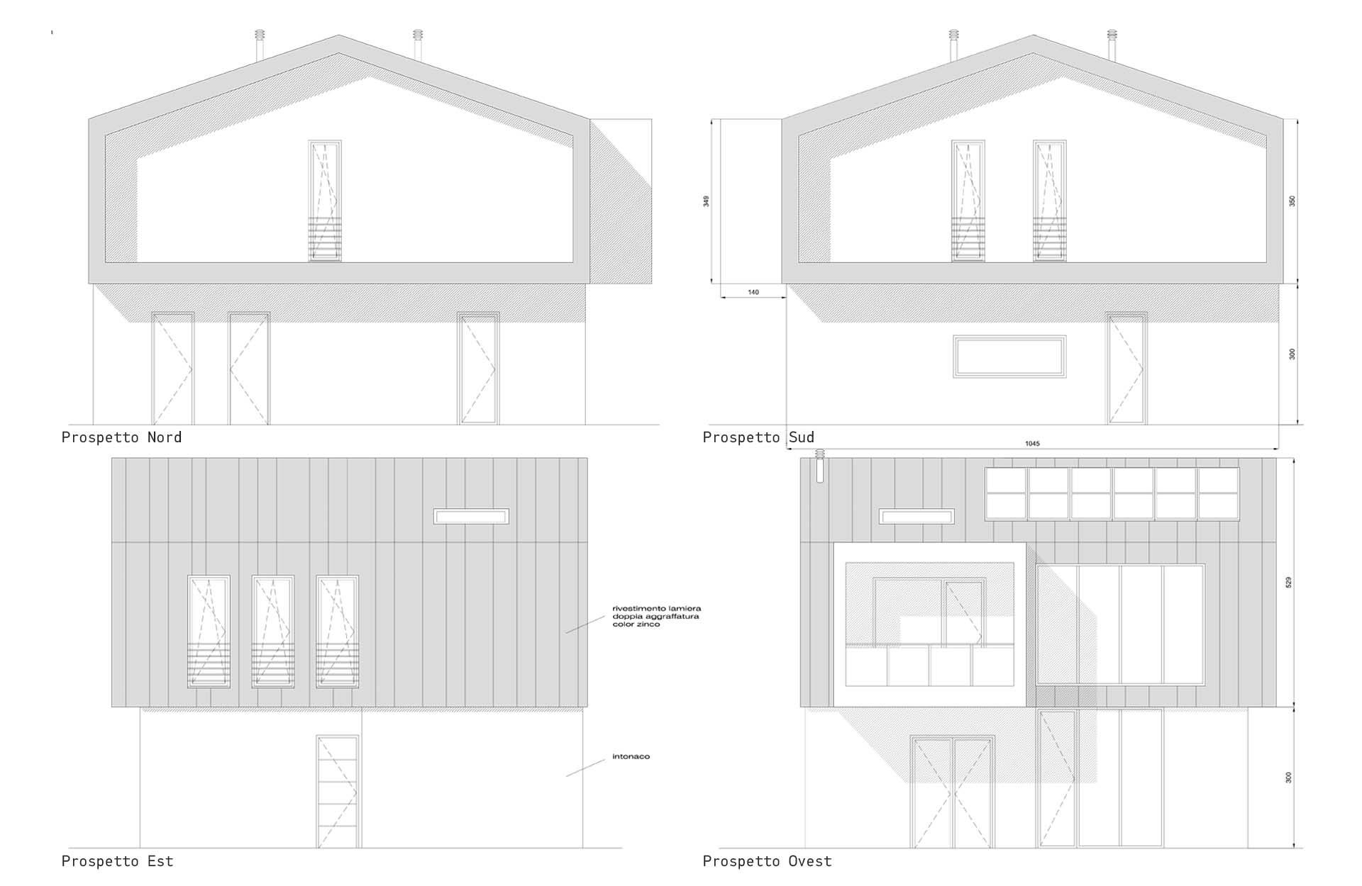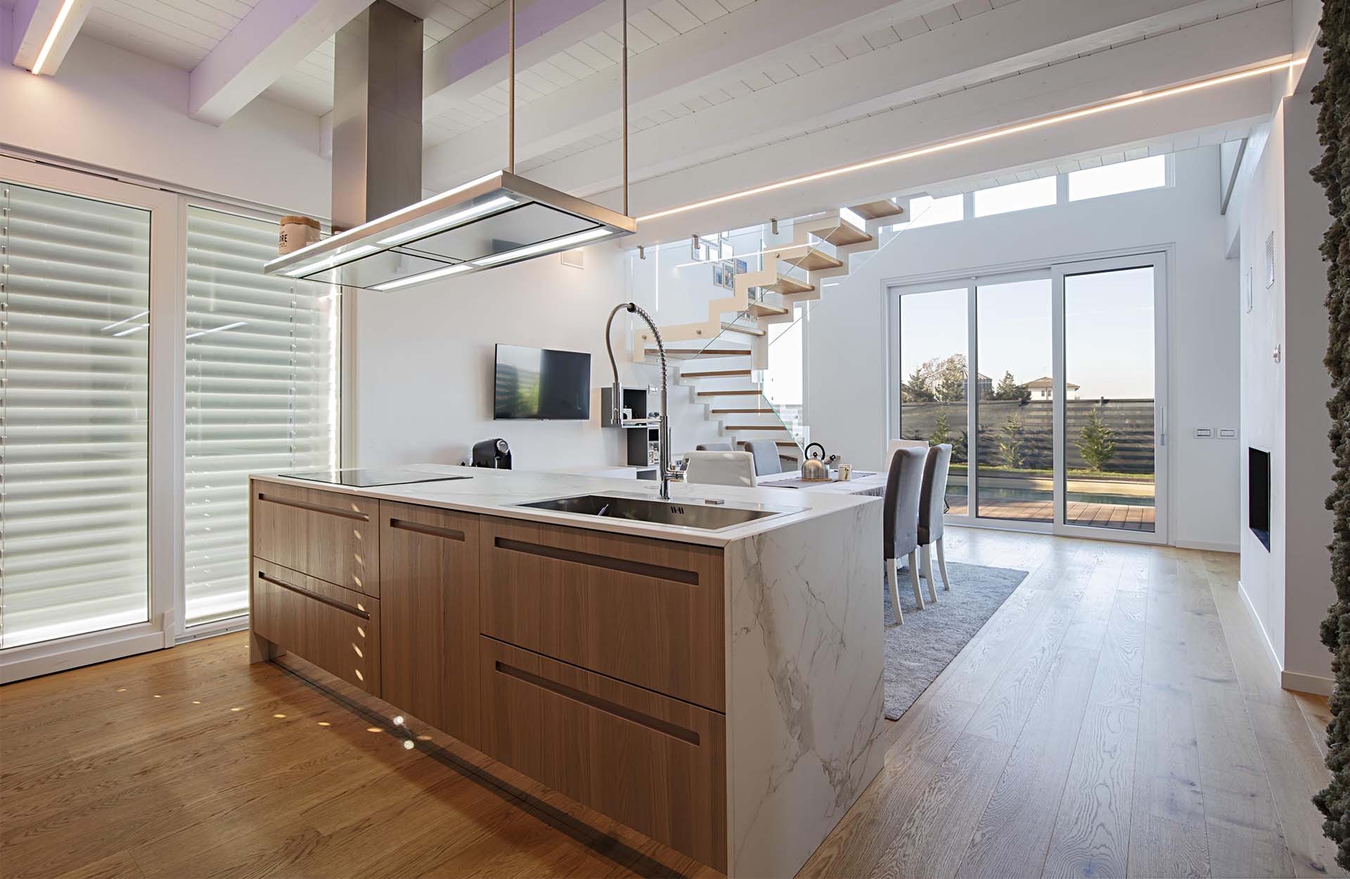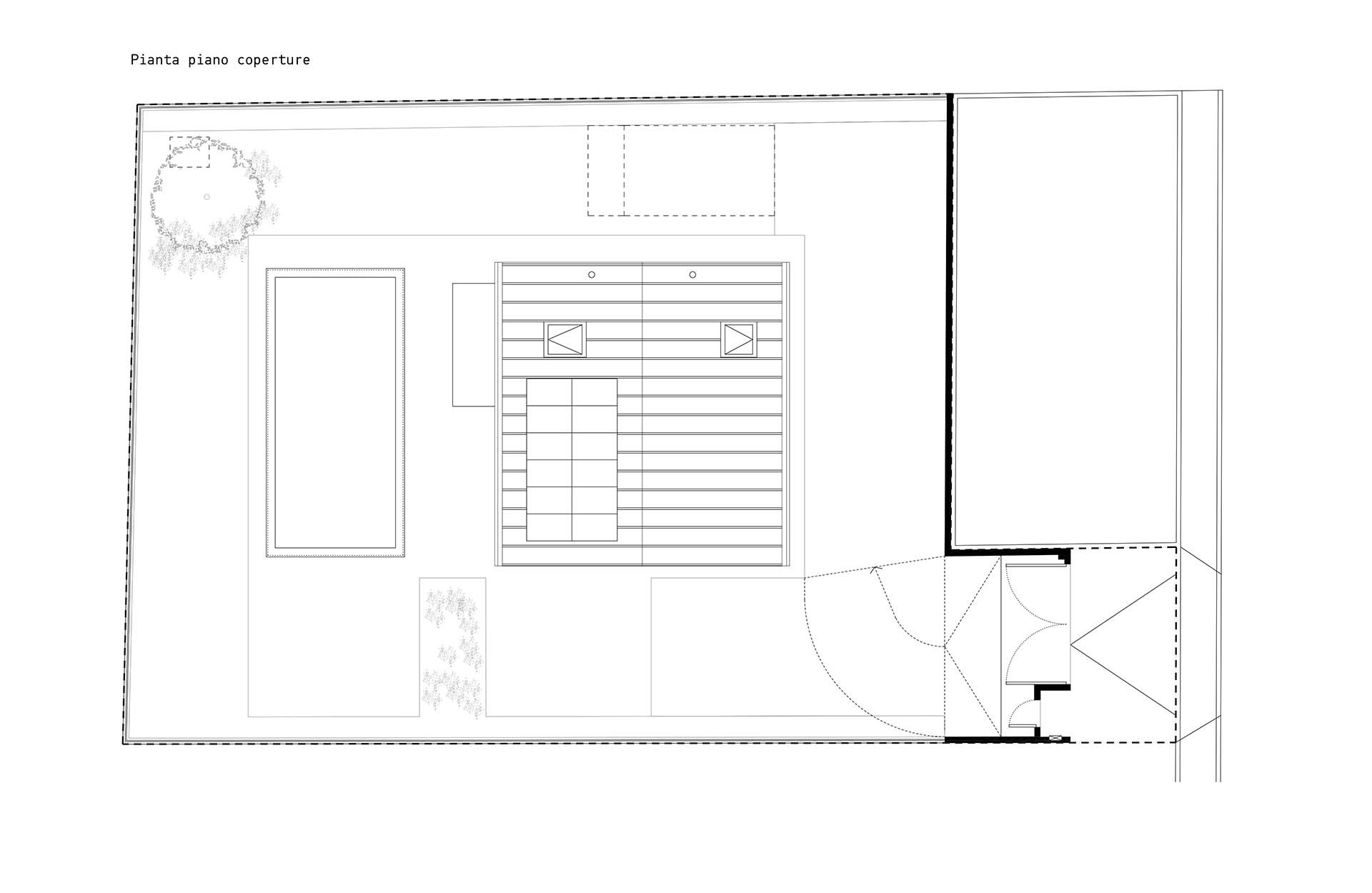 L’abitazione si sviluppa su due piani ed è caratterizzata da un luminoso soggiorno a doppia altezza in cui la scala scenografica, che conduce alle camere del primo piano, permette la completa percezione dei volumi e la apre alla vista suggestiva del territorio circostante. La casa si caratterizza per la notevole compattezza dei volumi e per la sostanziale opacità delle pareti a cui fa da contraltare la totale apertura del fronte Ovest e Sud: un equilibrio tra la volontà di rendere la casa estremamente efficiente a livello energetico e il desiderio di percepire il cambio delle stagioni, di captare e di modulare la luce solare durante tutto l’anno e di godere della vista del giardino e della piscina.