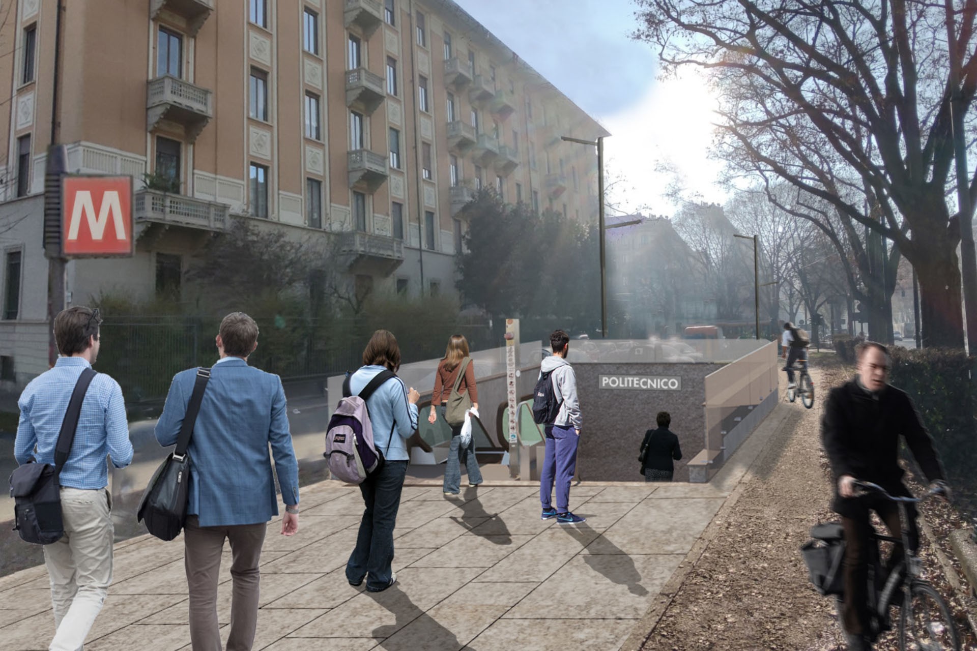 L’area di interfaccia tra la stazione e lo spazio urbano circostante sarà per lo più costituita dagli accessi (vano della scala fissa e/o delle scale mobili + cabina dell’ascensore). Il rivestimento delle pavimentazioni che circondano gli accessi sarà realizzato con pietre naturali di alta qualità (pietra di Luserna, granito di Montorfano ecc.…) o in lastre di pietra ricostituita in relazione ai materiali dell’ambiente urbano circostante. Inoltre, quando gli elementi delle emergenze di stazione saranno prossimi tra loro, la pavimentazione sarà disegnata in modo da integrarli maggiormente in un disegno unitario e identitario.