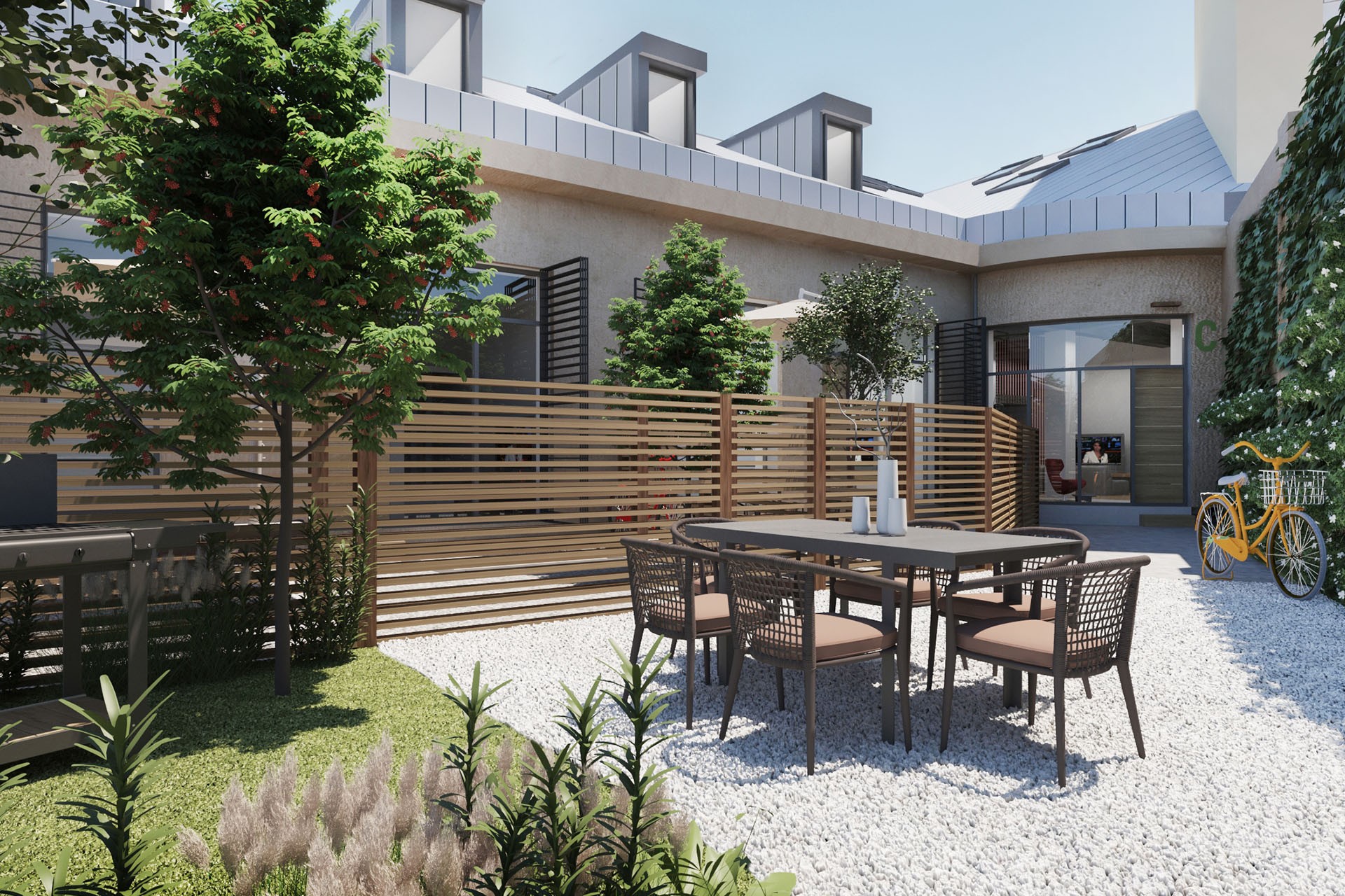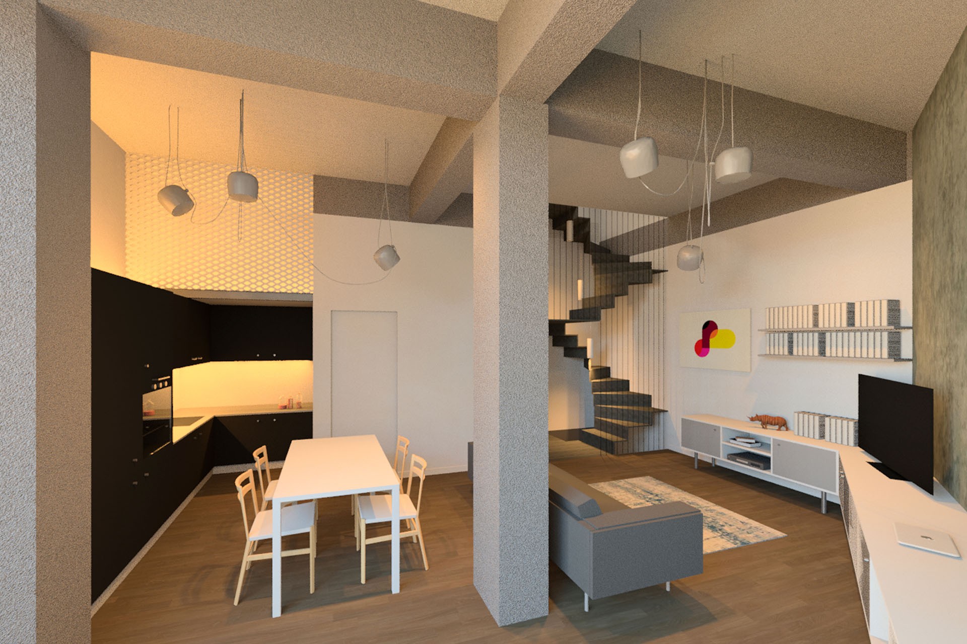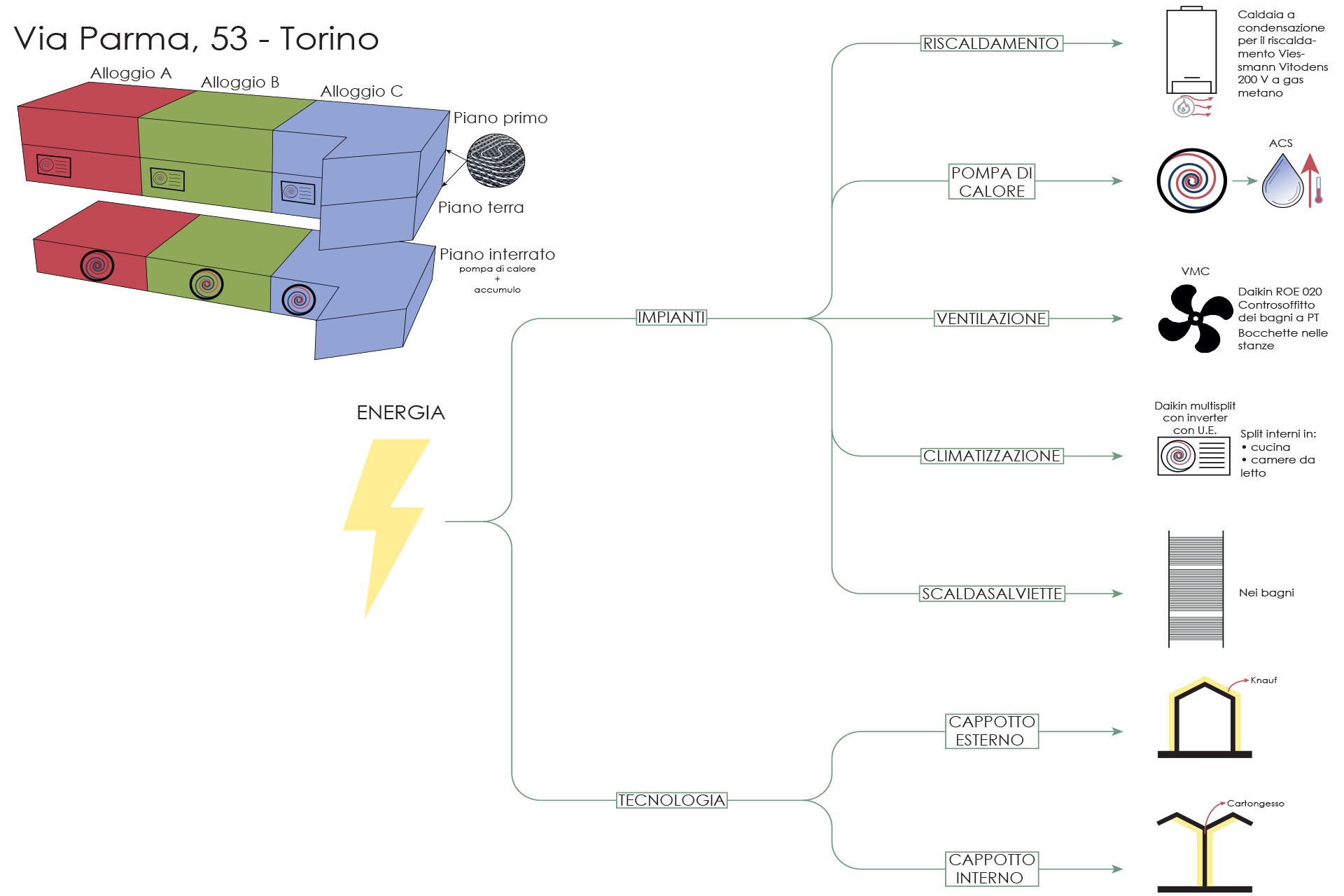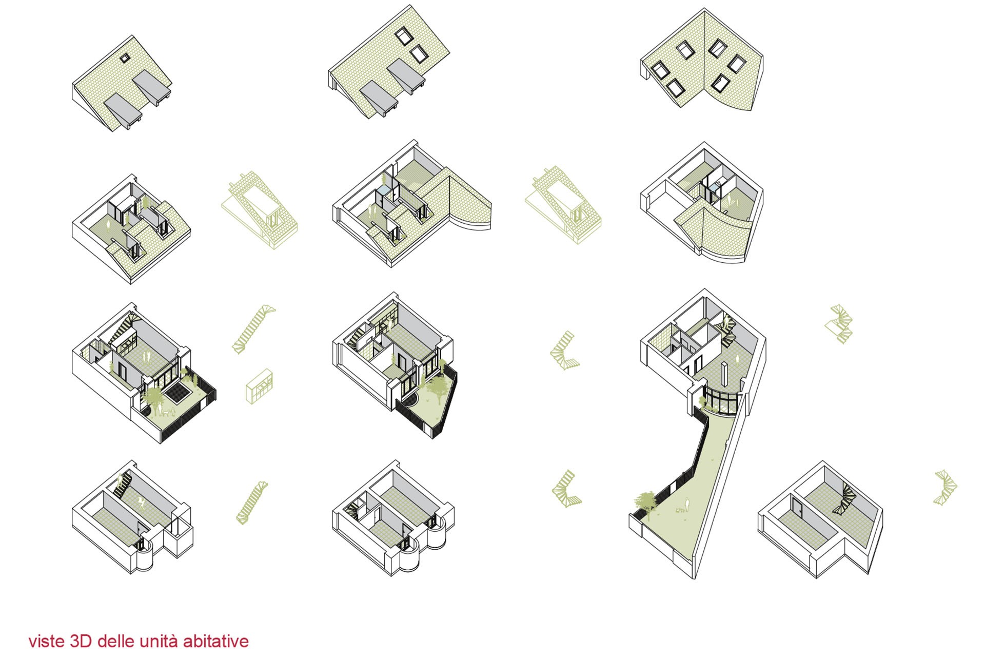Il volume è costituito da una manica che si sviluppa lungo un cortile interno ad uso esclusivo e comprende tre unità residenziali duplex costituite ognuna da due piani fuori terra: un piano terreno da cui si accede attraverso il giardino privato e un piano sottotetto collegato tramite una scala interna. Completa ogni unità un piano interrato adibito a locali multifunzione e una cantina. Le unità abitative sono dotate di un sistema impiantistico e tecnologico all’avanguardia che garantisce la classe energetica A4.
