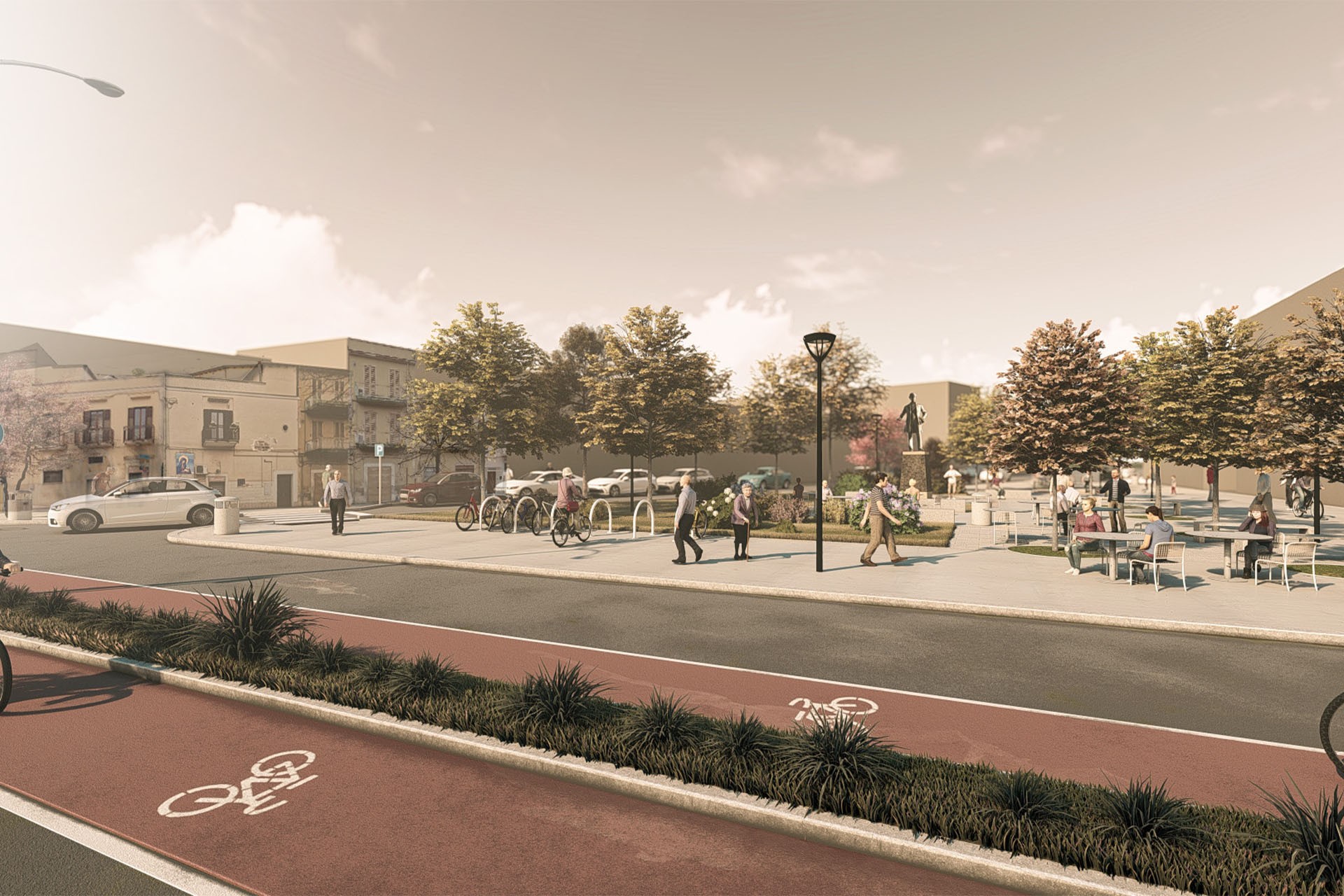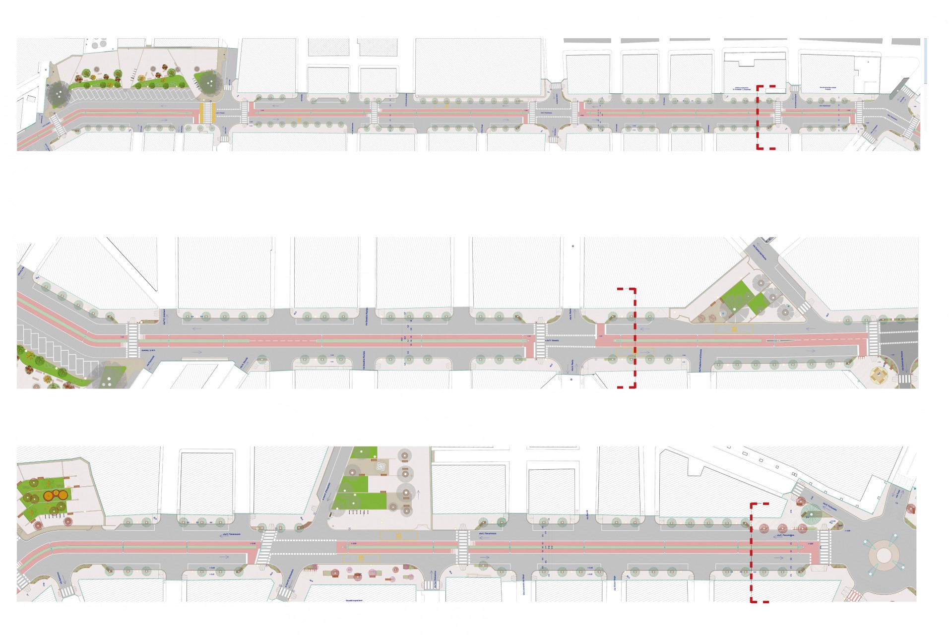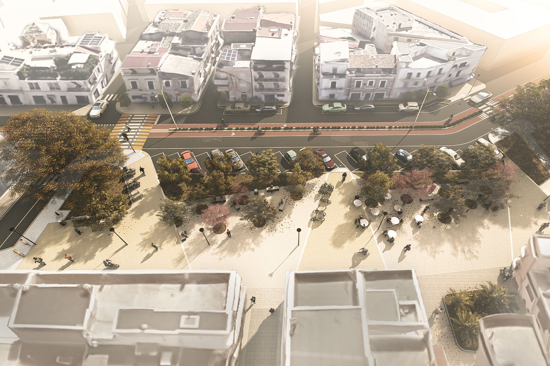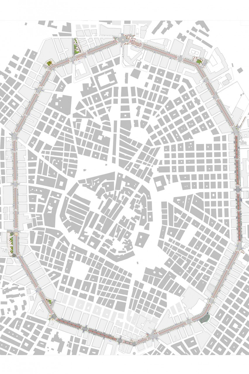 L’ambito d’intervento del progetto “ECOESTRAMURALE” riguarda l’attuale l’extramurale del comune di Corato, l’anello più esterno della mobilità che unisce e insieme delimita una parte del tessuto urbano. Si tratta di uno degli elementi principali e portanti della viabilità urbana, costituito da Via Ettore Fieramosca, Viale V. Veneto, Via IV Novembre, Viale A. Diaz e Viale Luigi Cadorna, lambisce da una parte il tessuto storico compatto, dall’altra quello di impianto storico e di nuova espansione. Il presente progetto esecutivo riguarda la Rigenerazione degli spazi dell’Estramurale urbano e riguarda le opere di riqualificazione viaria e i percorsi ciclabili previsti sul sedime dell’anello viario dell’”Estramurale”, la riqualificazione delle aree pedonali presenti lungo il viale e la riqualificazione di 5 piazze. L’intervento si basa sulla realizzazione di aree verdi e percorsi di mobilità dolce che permettono a tutti gli utenti di fruire degli spazi pubblici tramite l’abbattimento di barriere architettoniche, favorendo la pedonalilità, riducendo l’inquinamento e il traffico. Le riqualificazioni sono comprensive di nuove pavimentazioni, nuove alberature, nuovi impianti di raccolta delle acque. Il progetto non solo prevede una nuova sezione stradale riproporzionando lo spazio carrabile, pedonale e ciclabile, ma mira anche al recupero di tutti i principali slarghi e piazze che insieme al ridisegno delle intersezioni aumentano la quota di spazio pedonale nel tessuto urbano.